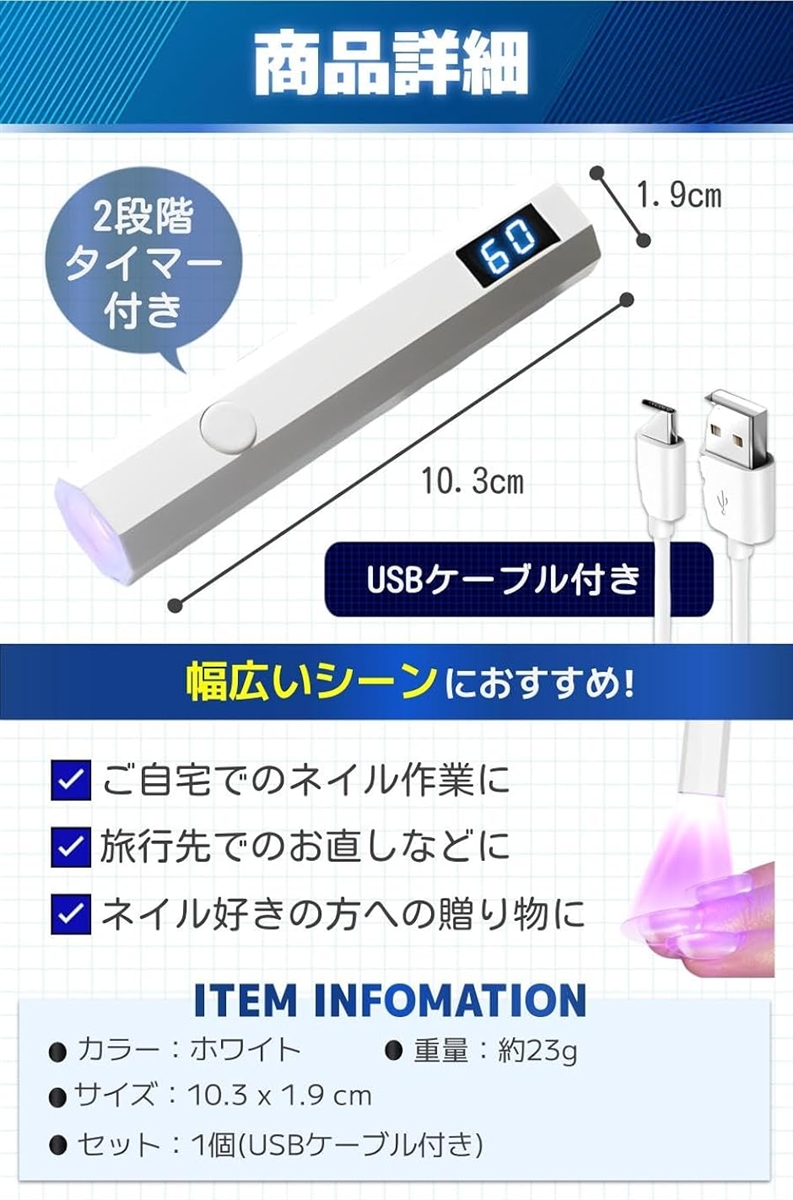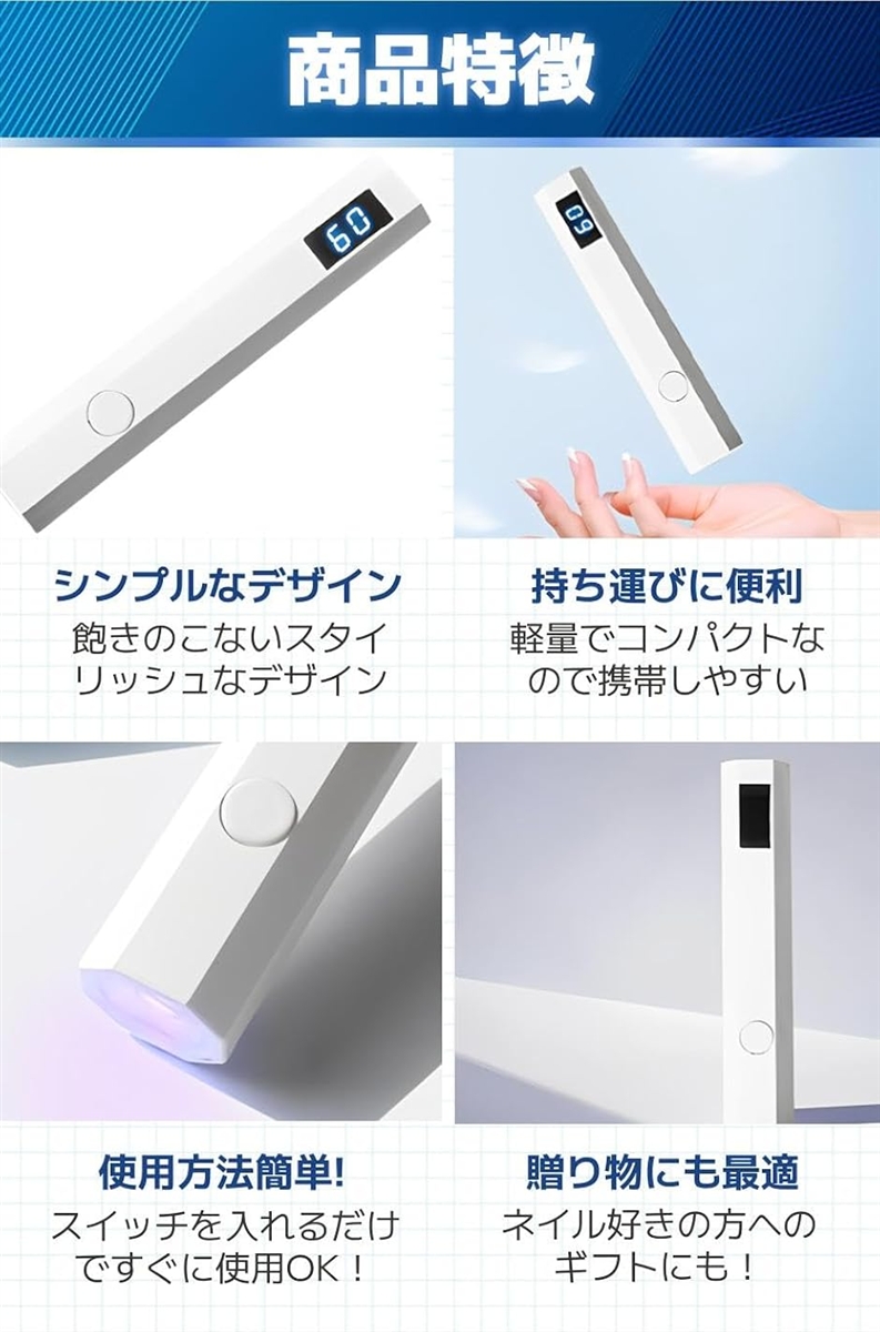 「商品特徴」(1)シンプルなデザイン:飽きのこないスタイリッシュなデザイン/(2)持ち運びに便利:軽量でコンパクトなので携帯しやすい/(3)使用方法簡単.:スイッチを入れるだけですぐに使用OK。/(4)贈り物にも最適:ネイル好きの方へのギフトにも。