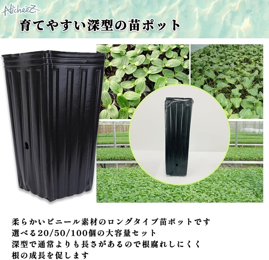 「育てやすい深型の苗ポット」柔らかいビニール素材のロングタイプ苗ポットです。
