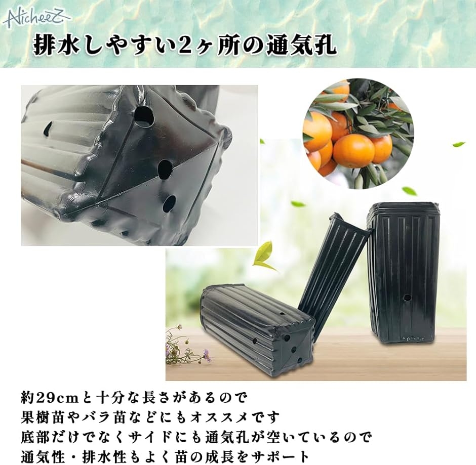「排水しやすい2ヶ所の通気孔」約29cmと十分な長さがあるので、果樹苗やバラ苗などにもオススメです。