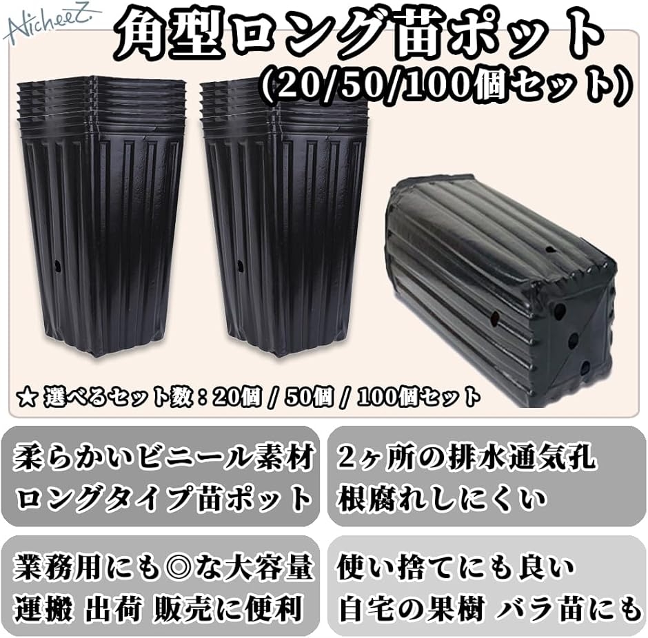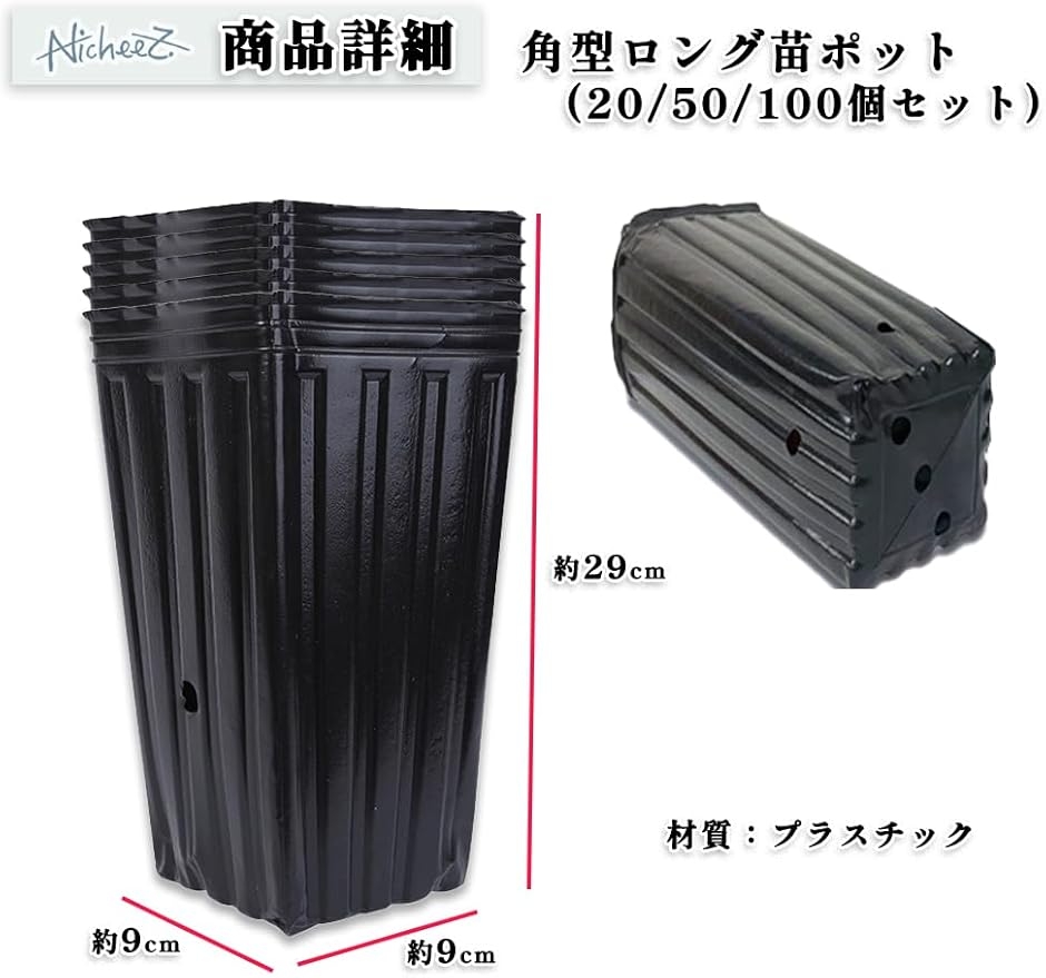 「商品内容」 角型ロング苗ポット(20/50/100個セット) 材質:プラスチック カラー:ブラック サイズ:底部直径/約9cm 長さ/約29cm