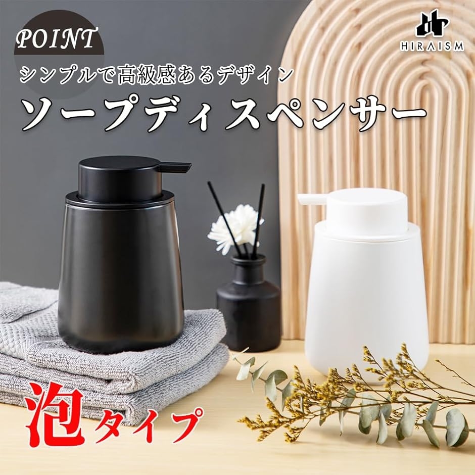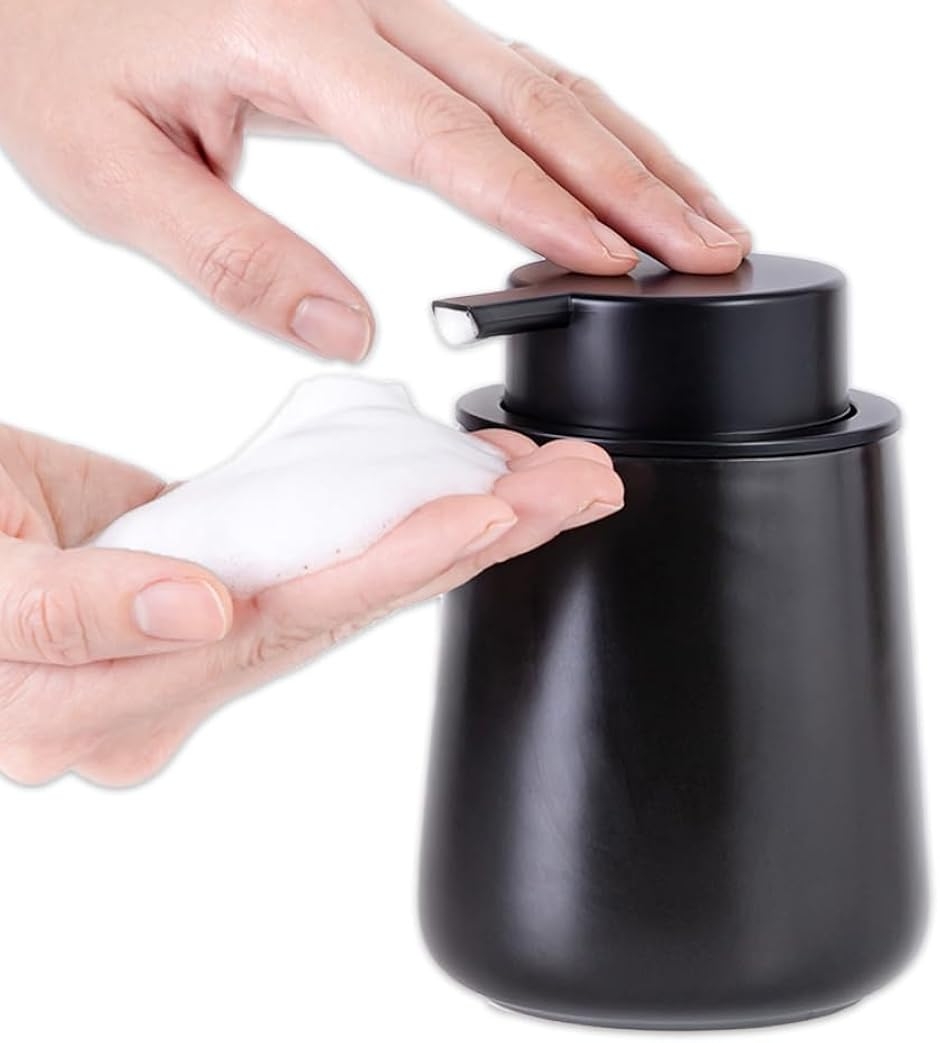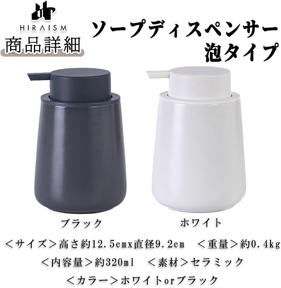 「商品内容」泡ソープディスペンサー <サイズ>高さ約12.5cmx直径9.2cm <重量>約0.4kg <内容量>約320ml <素材>セラミック <カラー>ホワイトorブラック *ご注意*液体洗剤はおすすめしません。