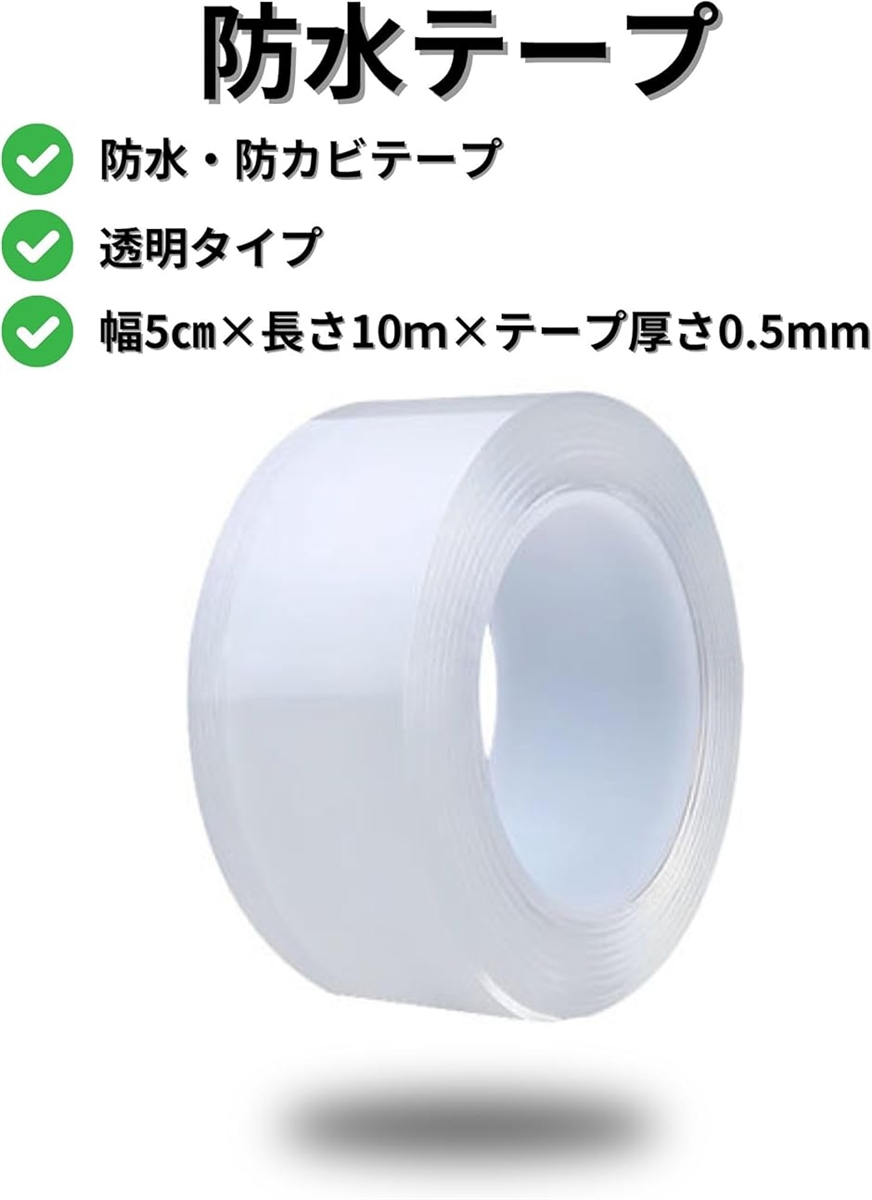 | 商品名 | 防水テープ 透明テープ 補修テープ 幅広 浴槽 キッチン 洗面台 コンロ周り 配管 防水 防カビ 汚れ防止 強粘 |