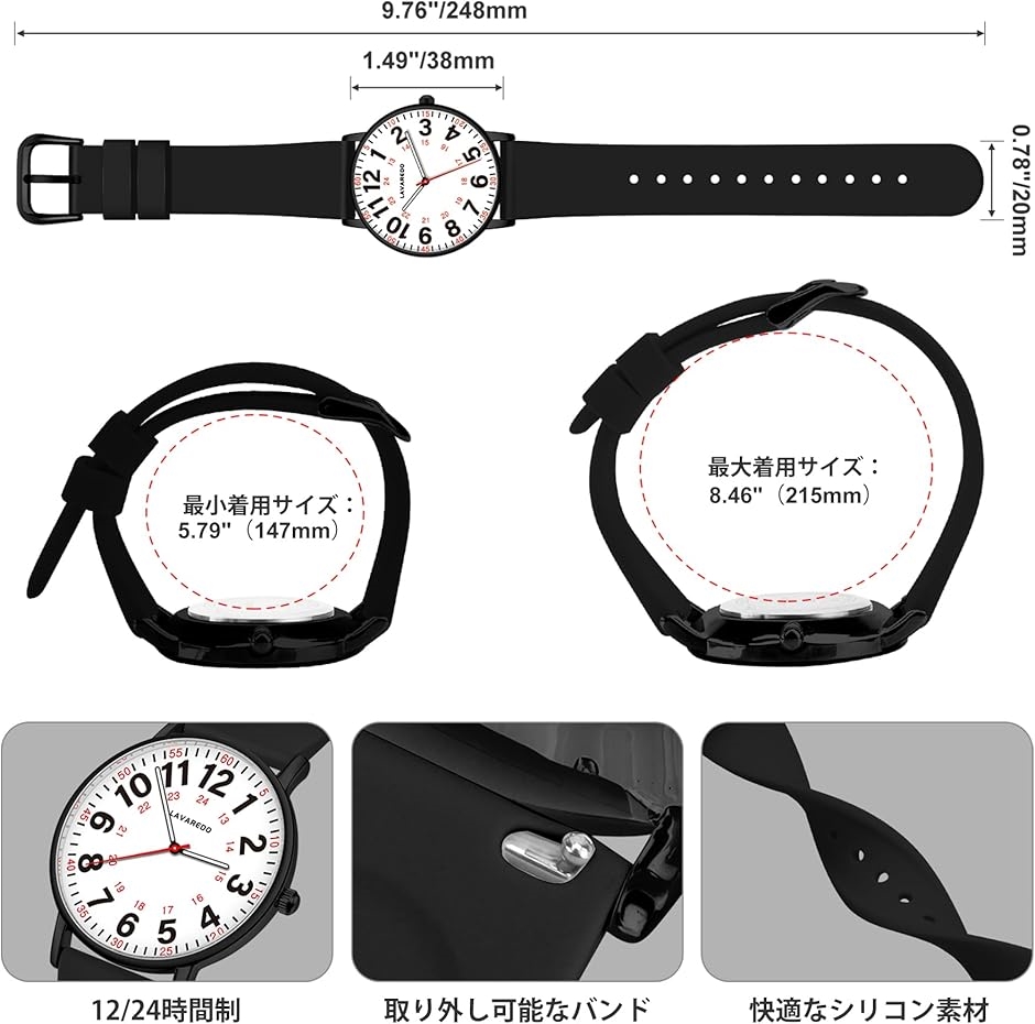 見やすい腕時計:読みやすい大きなダイヤル、12/24時間制の表示し、発光する蛍光文字盤を兼ね備えた。