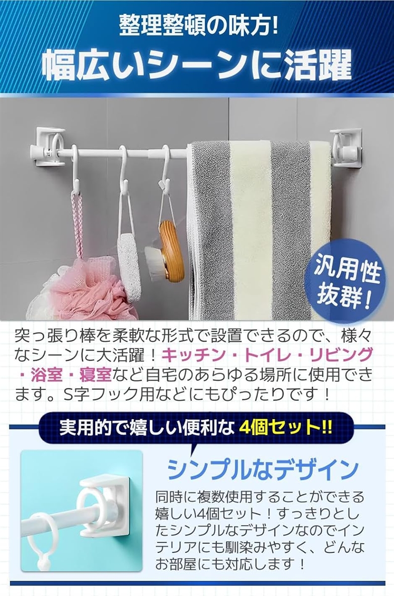 「幅広いシーンに活躍」突っ張り棒を柔軟な形式で設置できるので、様々なシーンに大活躍。キッチン・トイレ・リビング・浴室・寝室など自宅のあらゆる場所に使用できます。
