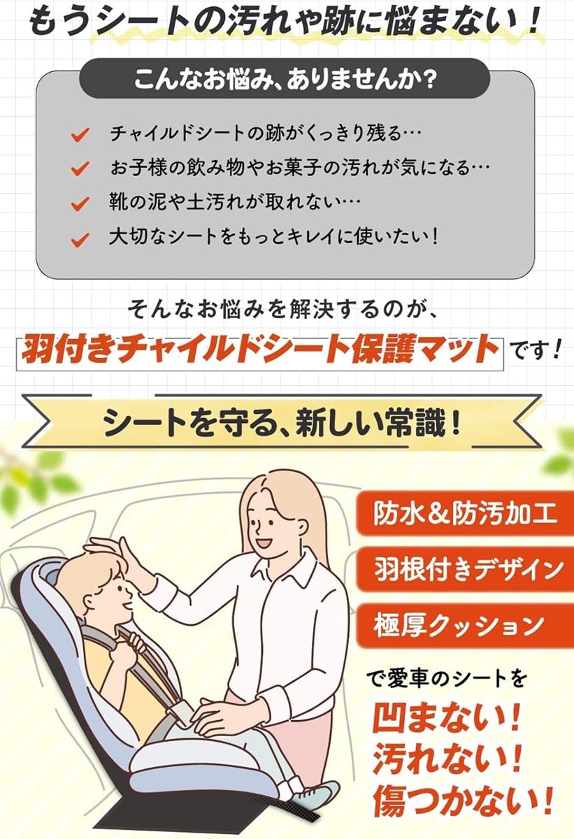「保育士推奨」乳幼児や未就学児童の保育のプロである現役ベテラン幼稚園教諭が推薦するチャイルドシート保護マット 「サイドもガード」羽根付きデザインのチャイルドシート 保護マット なのでシートのサイド・横も汚れからガード