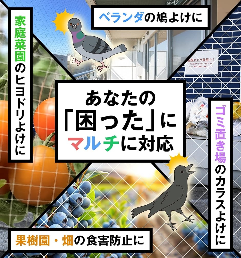 ベランダの鳥糞被害を防ぐだけでなく、ゴミ置き場のカラス対策、農業や家庭菜園の鳥害対策にも最適です。