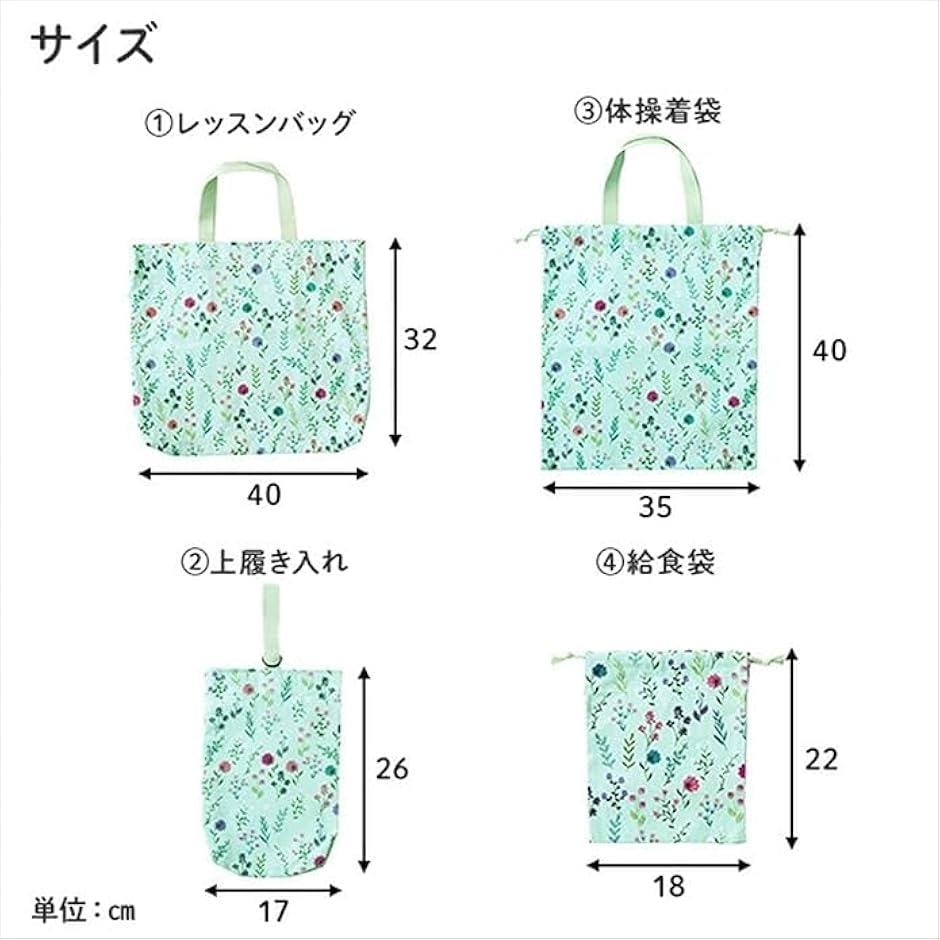サイズ:レッスンバッグ:約W40 D3 H32/上履き入れ:約W17 D4 H26/体操着袋:約W35 H40/給食袋:約W18 H22/ネームタグ付き/液温は40 ℃を限度とし、洗濯機で非常に弱い処理が出来る