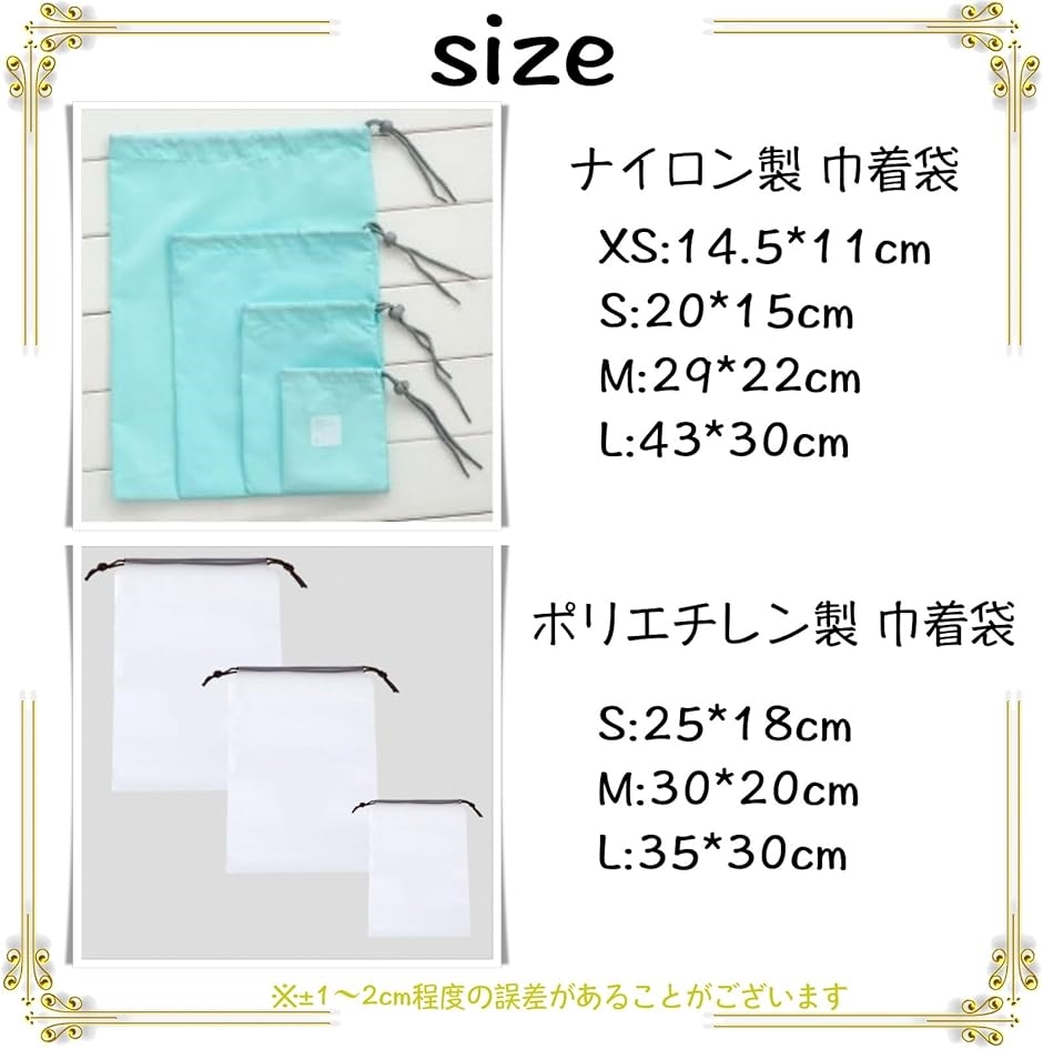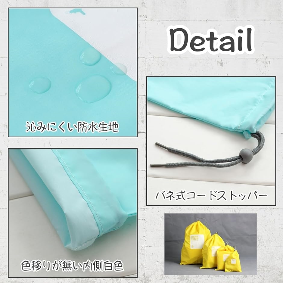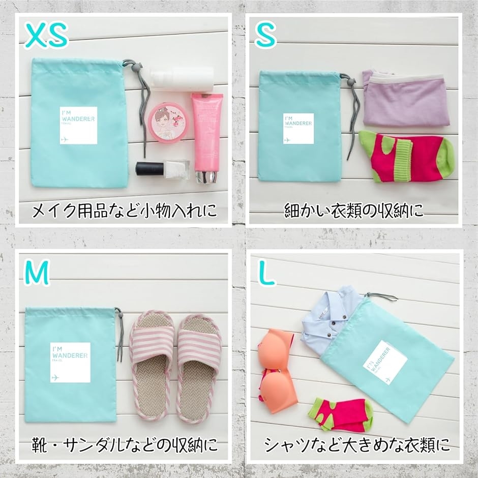 旅行やアウトドアで活躍するナイロン製の巾着袋 トラベルポーチは、防水性があり、4つのサイズ展開で衣類や小物の整理に最適です。