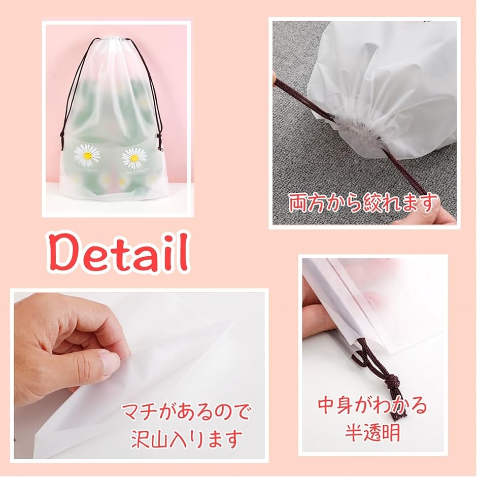 濡れたものを収納できる半透明のポリエチレン製の防水巾着袋も3サイズ展開で、メイク用品・水着やタオルなどを他の荷物から分けて持ち運べます。