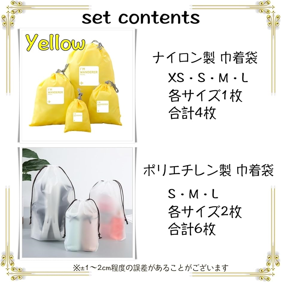 《サイズ》ナイロン製巾着袋:SS / 14.5x11cm・S / 20x15cm・M / 29x22cm・L / 43x30cm ポリエチレン製巾着袋:小 / 18x25cm・中 / 20x30cm・大 / 30x35cm《セット内容》ナイロン製巾着袋:各サイズ1枚 合計4枚・ポリエチレン製巾着袋:各サイズ2枚 合計6枚《カラー》ナイロン製巾着袋:ブラウン / イエロー・ポリエチレン製巾着袋:半透明