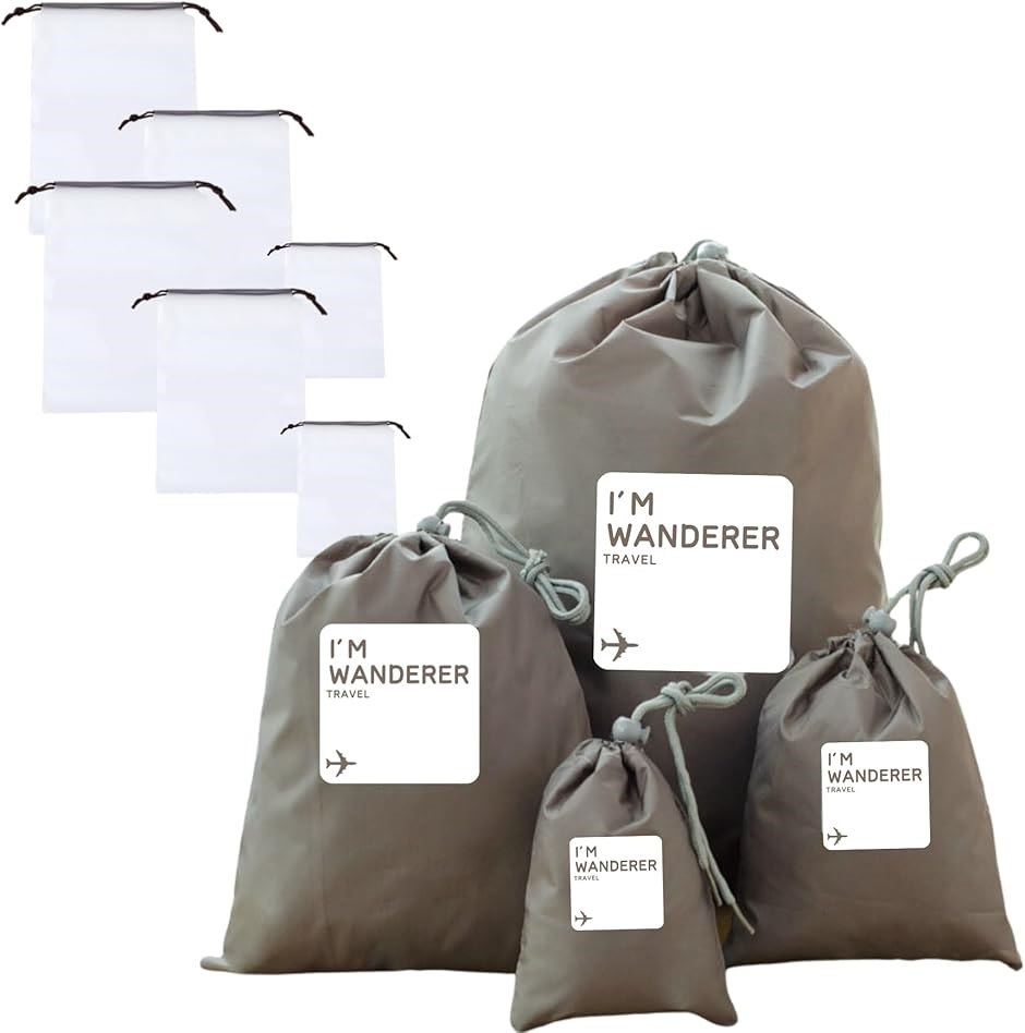 旅行やアウトドアで活躍するナイロン製の巾着袋 トラベルポーチは、防水性があり、4つのサイズ展開で衣類や小物の整理に最適です。