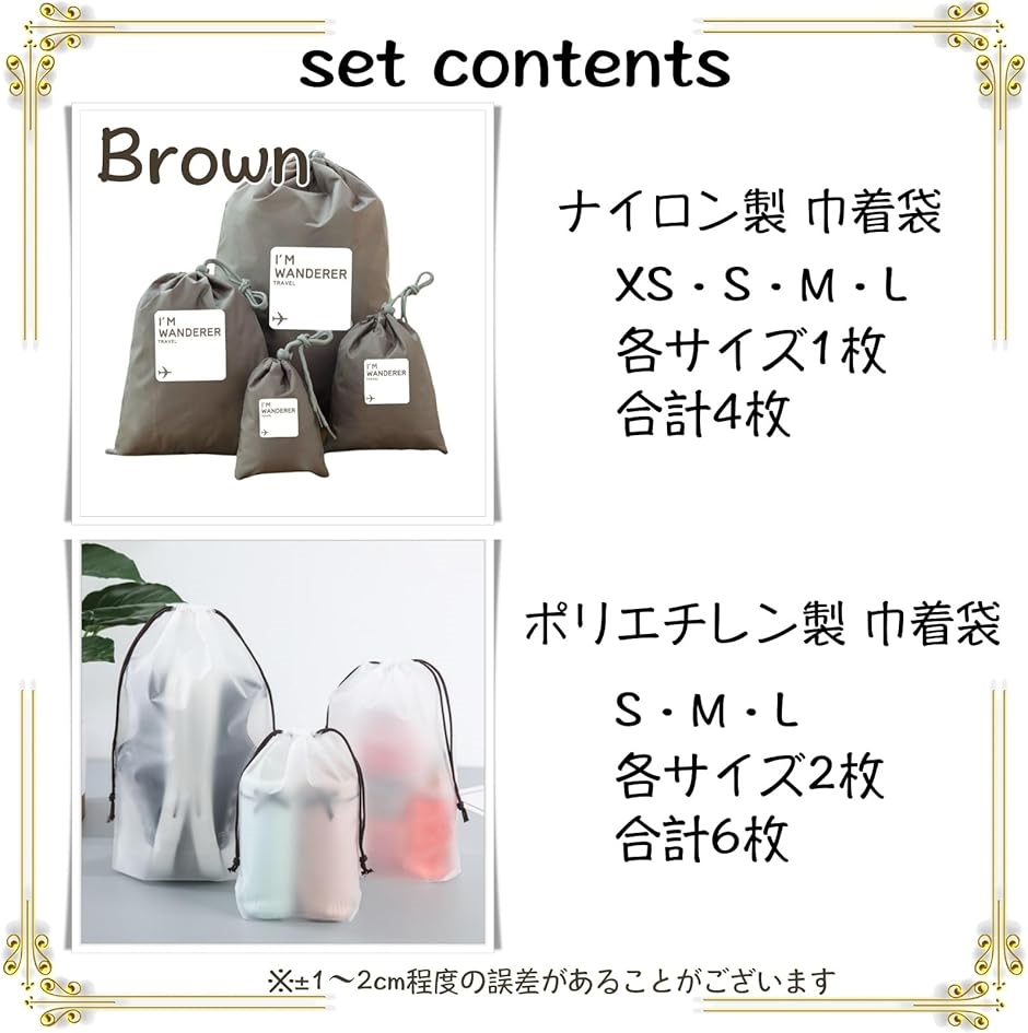 《サイズ》ナイロン製巾着袋:SS / 14.5x11cm・S / 20x15cm・M / 29x22cm・L / 43x30cm ポリエチレン製巾着袋:小 / 18x25cm・中 / 20x30cm・大 / 30x35cm《セット内容》ナイロン製巾着袋:各サイズ1枚 合計4枚・ポリエチレン製巾着袋:各サイズ2枚 合計6枚《カラー》ナイロン製巾着袋:ブラウン / イエロー・ポリエチレン製巾着袋:半透明