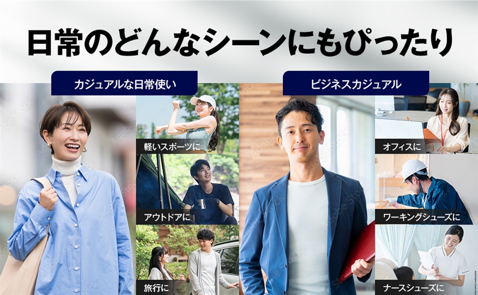 普段履きや旅行用としてだけでなくオフィスシューズ、店舗勤務、医療・福祉関係、清掃員の方などにもおすすめの長時間履いていても足が疲れにくいシューズです。