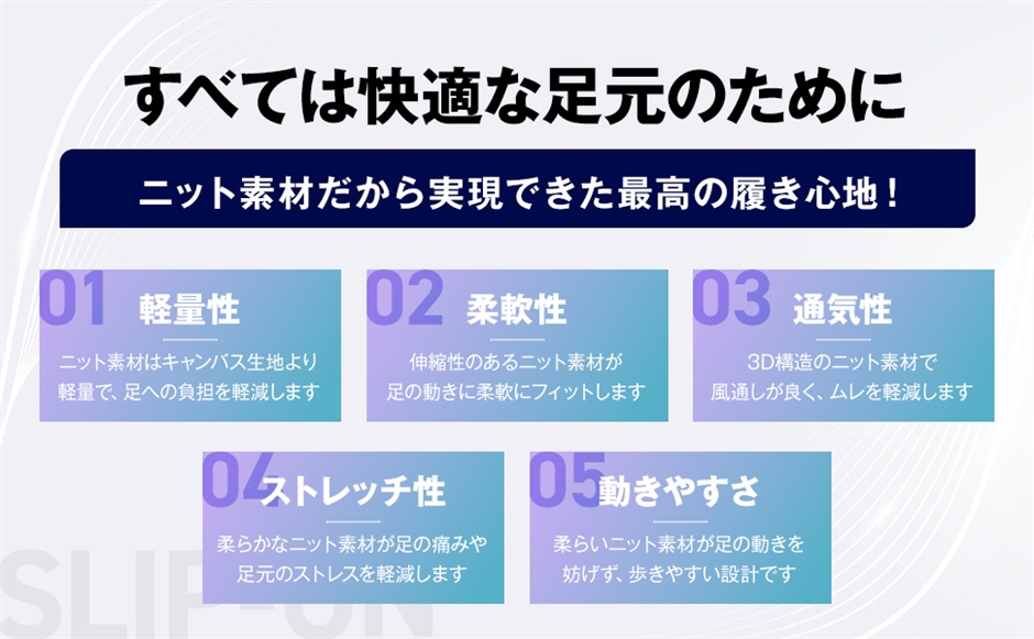 「新感覚の心地よさ」柔軟で伸縮性に優れたニットアッパーが足全体を優しく包み込み、心地よいフィット感を実現するデッキシューズタイプのスリッポンシューズです。