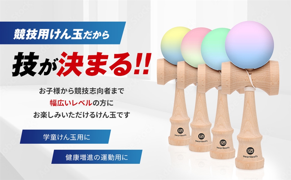 「技が決まる。競技用けん玉」 Heart Beat's けん玉は、技の決まりやすさを追求した高品質な競技用けん玉です。