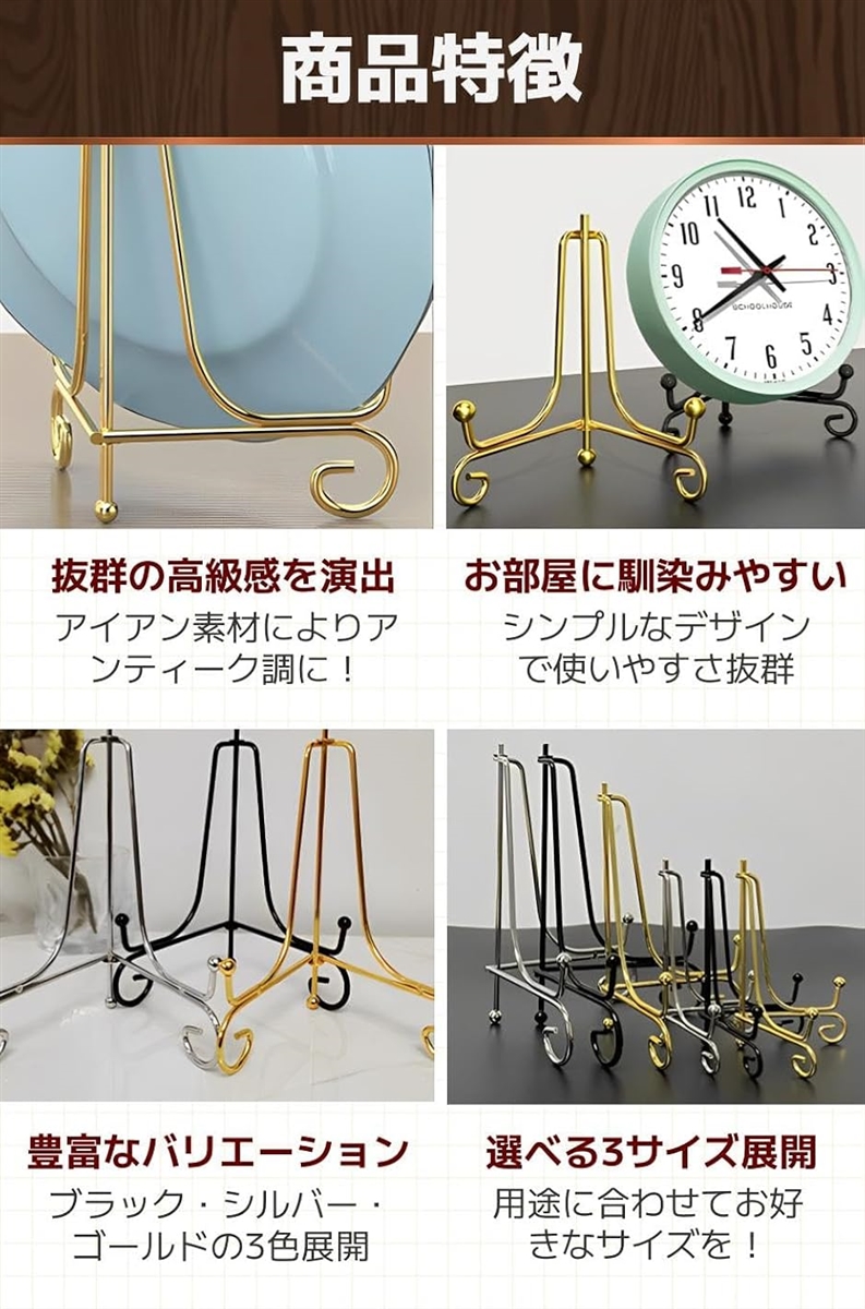 「商品特徴」(1)抜群の高級感を演出:アイアン素材によりアンティーク調に。/(2)お部屋に馴染みやすい:シンプルなデザインで使いやすさ抜群/(3)豊富なバリエーション:ブラック・シルバー・ゴールドの3色展開/(4)選べる3サイズ展開:用途に合わせてお好きなサイズを。