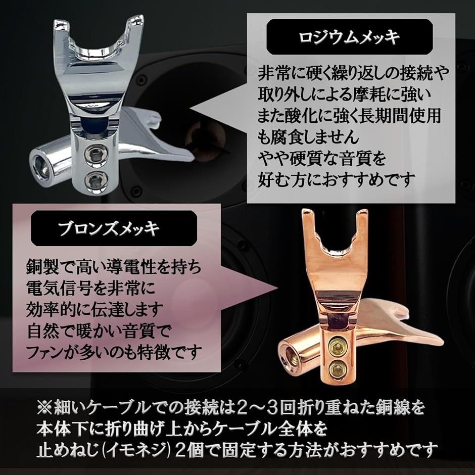 「仕様」セット内容:Yラグ端子(スピーカープラグ)4個、止めねじ(イモネジ)2個 / バリエーション:金メッキ(24K)、ロジウムメッキ、銅メッキ / サイズ:全長42mm、外幅約13mm、内幅6〜8mm、厚み2mm、ケーブル接続用孔径φ4.5mm *細いケーブルでの接続は、2〜3回折り重ねた銅線を本体下に折り曲げ、上からケーブル全体を止めねじ(イモネジ)2個で固定する方法がおすすめです。