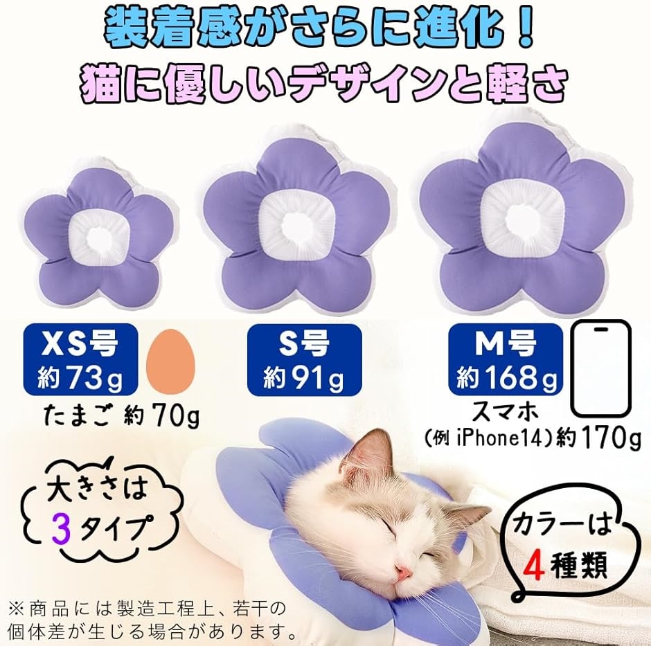 「驚きの軽さ&猫にやさしい設計」 軽量設計で、XSサイズはわずか約73グラム。卵1個分ほどの軽さで、長時間つけていても負担が少なく、リラックスしたまま過ごせます。
