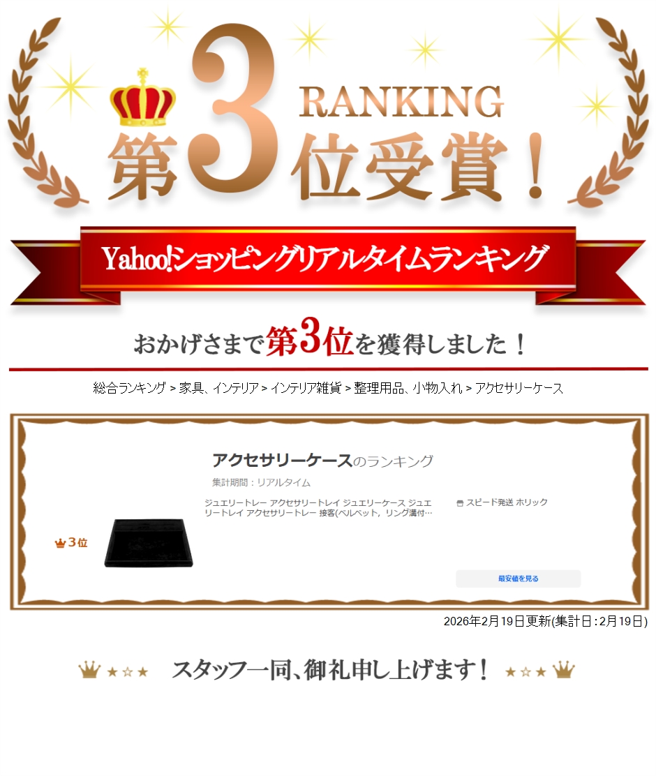 「アクセサリー収納の新定番」このアクセサリートレイは、リング溝付きで指輪をしっかり固定し、見た目も整然と美しく演出します。