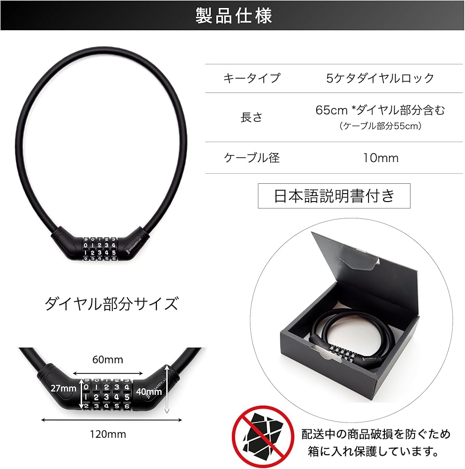 | 商品名 | ケーブルロック 自転車ロック 5ケタダイヤル式 回しやすい ワイヤーロック バイク キックボード |