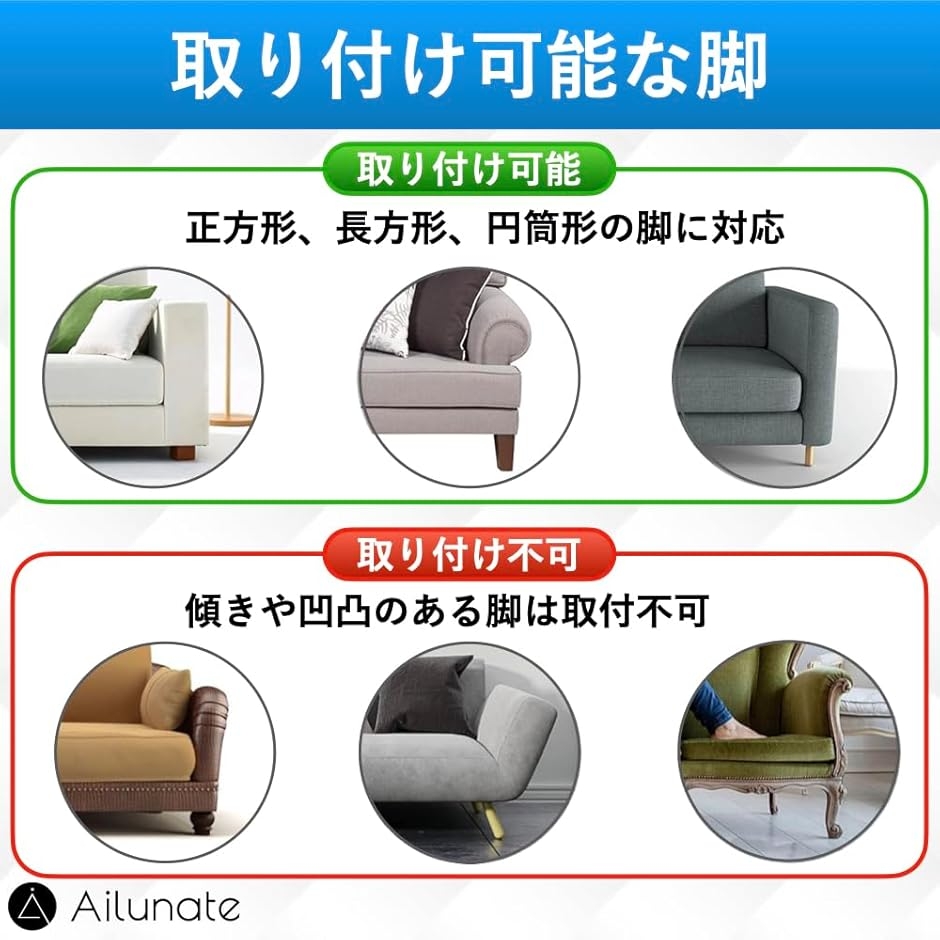 ソファーやベッドの脚に取り付けることができ、簡単にすぐに設置できます。