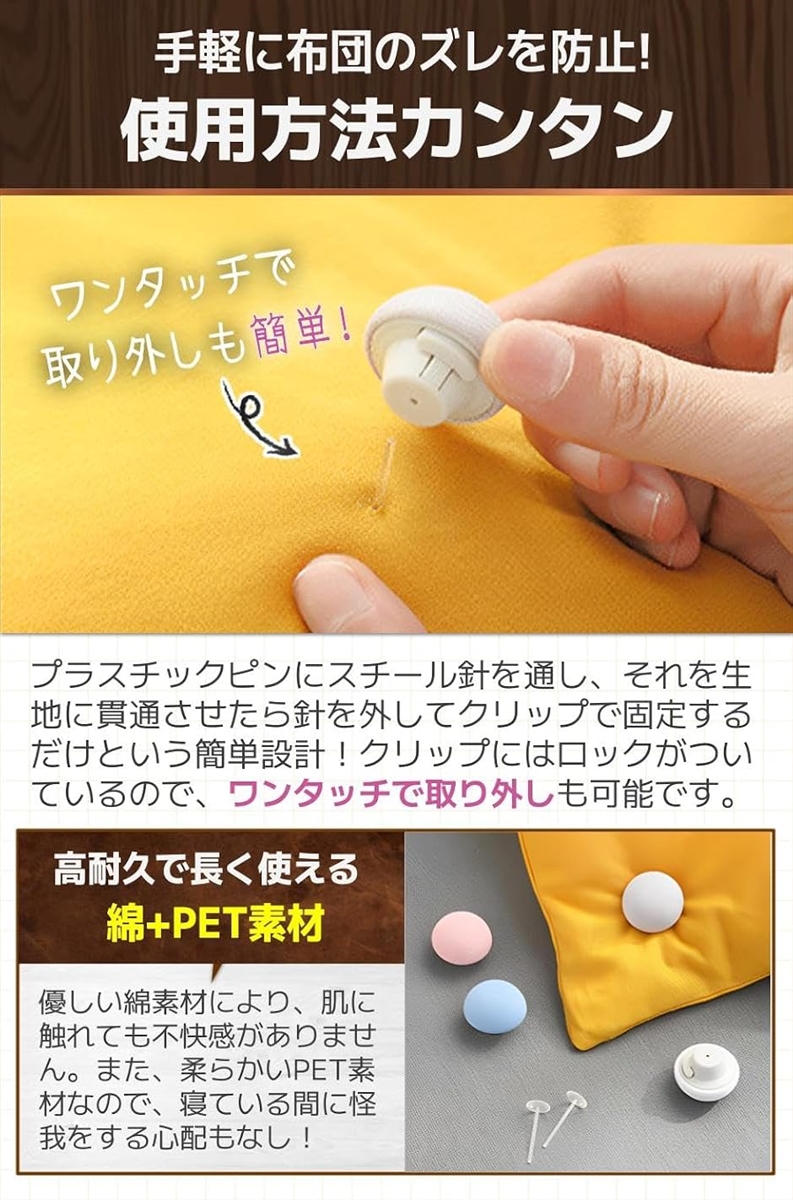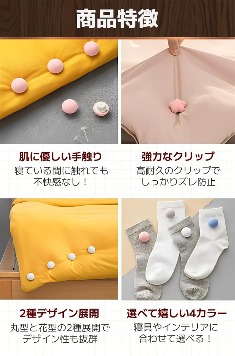 「商品特徴」(1)肌に優しい手触り:寝ている間に触れても不快感なし。/(2)強力なクリップ:高耐久のクリップでしっかりズレ防止/(3)2種デザイン展開:丸型と花型の2種展開でデザイン性も抜群/(4)選べて嬉しい4カラー:寝具やインテリアに合わせて選べる。