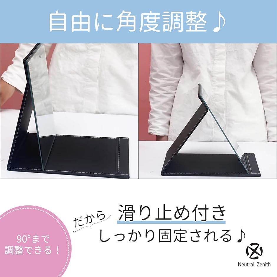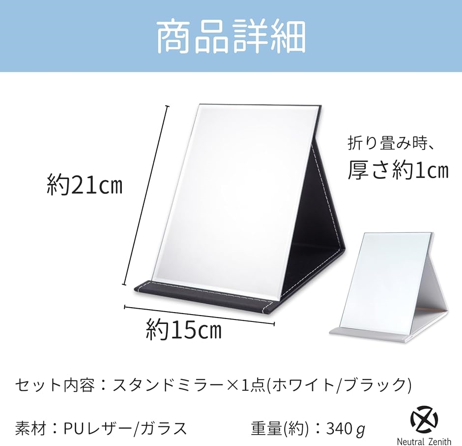 「商品情報」セット内容:スタンドミラーx1点 カラー:ホワイト / ブラック サイズ(約):(M)縦21cmx横15cmx厚さ1cm (L)縦25cmx横18cmx厚さ1cm 重量(約):(M)340g (L)470g 素材:PUレザー / ガラス