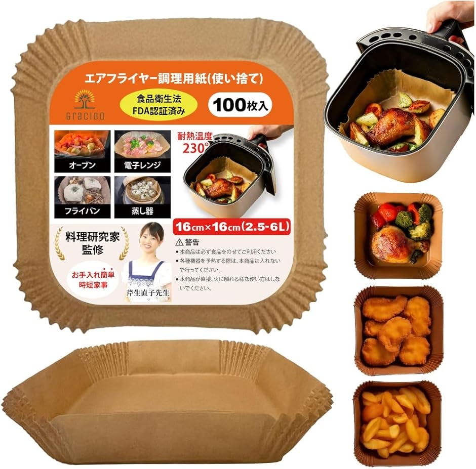 | 商品名 | エアフライヤーシート 料理研究家監修 クッキングシート エアフライヤー用紙 100枚入 食品衛生法適合 耐熱温度 230℃ オーブンシート 蒸し器 天ぷら敷紙 16cm 2.5〜6L用 |