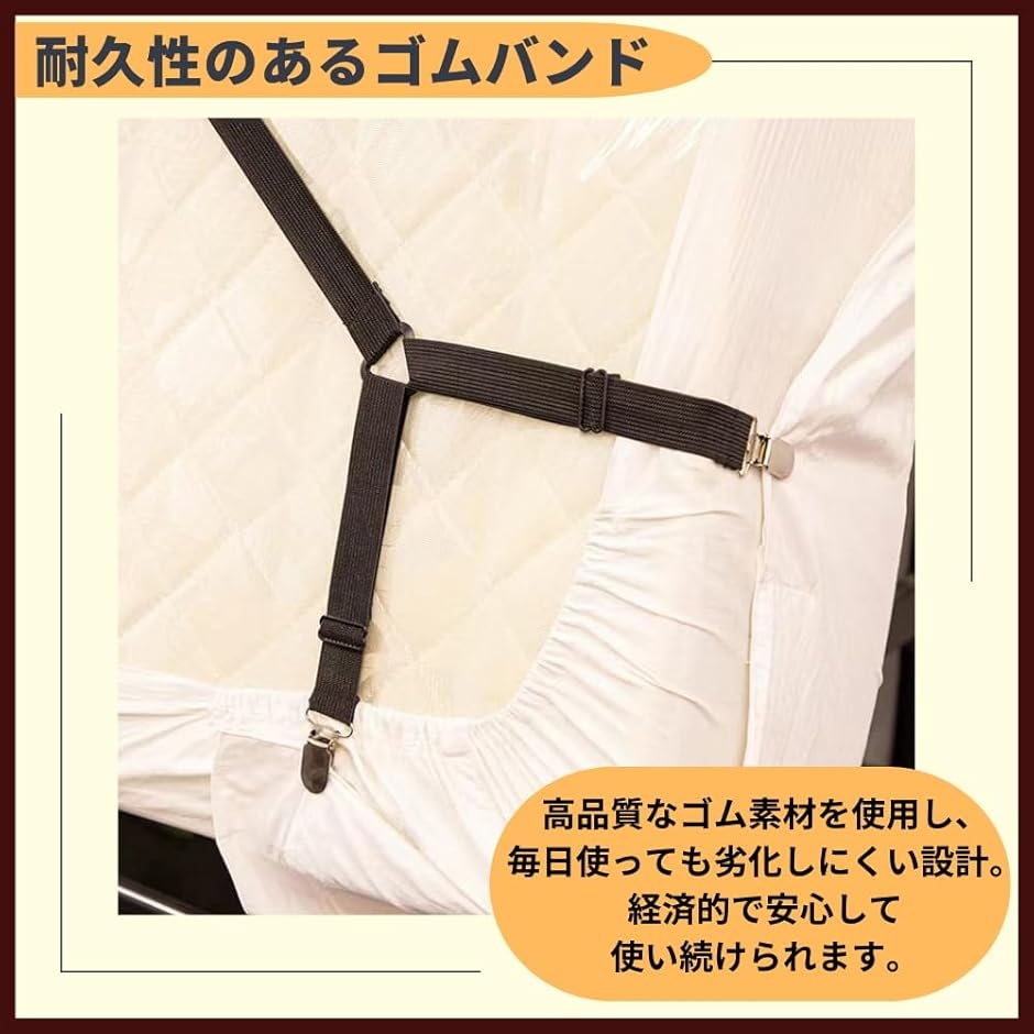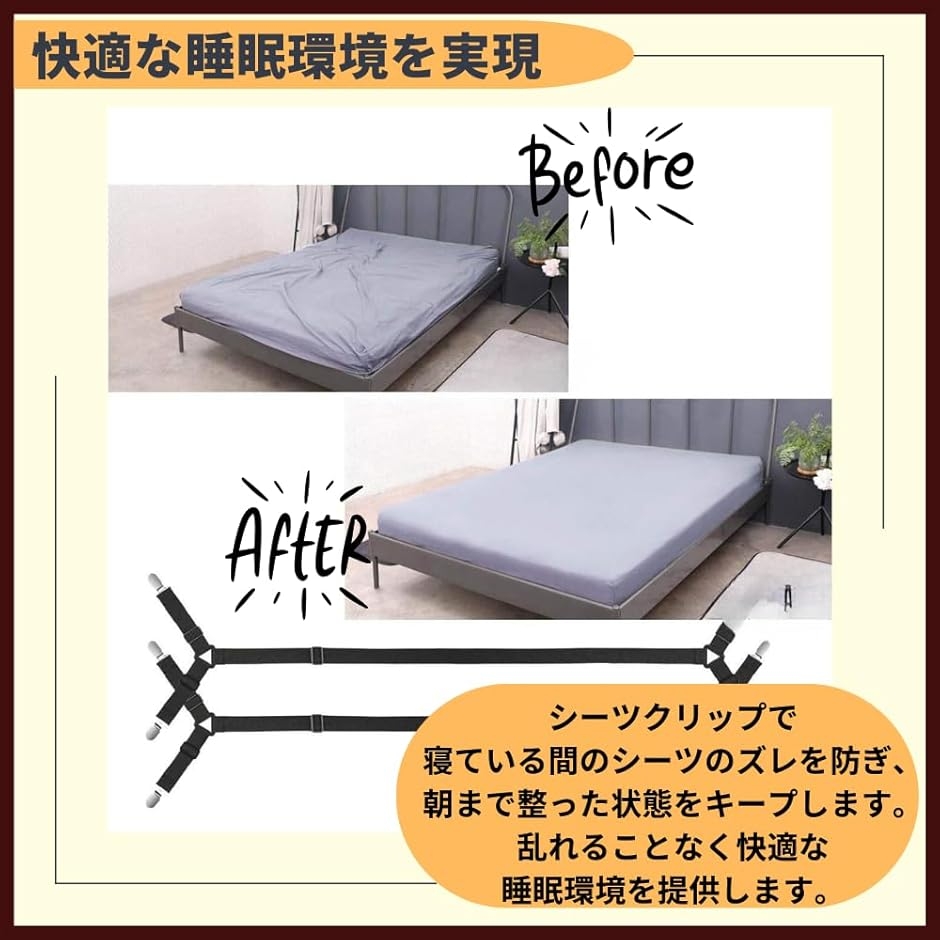 「快適な睡眠環境を実現」シーツクリップで寝ている間のシーツのずれを防ぎ、朝まで整った状態をキープします。