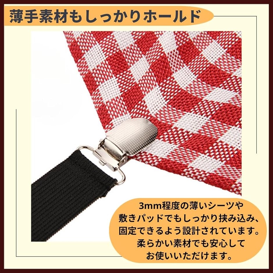 「薄手素材でも安心」3mm程度の薄いシーツや敷きパッドでもしっかり挟み込み、固定できるよう設計されています。