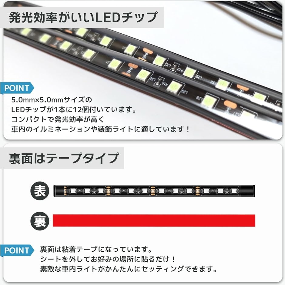 「取り回ししやすい配線」4本のテープライトは、約120cmの配線が2本、約170cmの配線が2本で構成されており、車両の前席と後席などに使いやすい構成となっています。