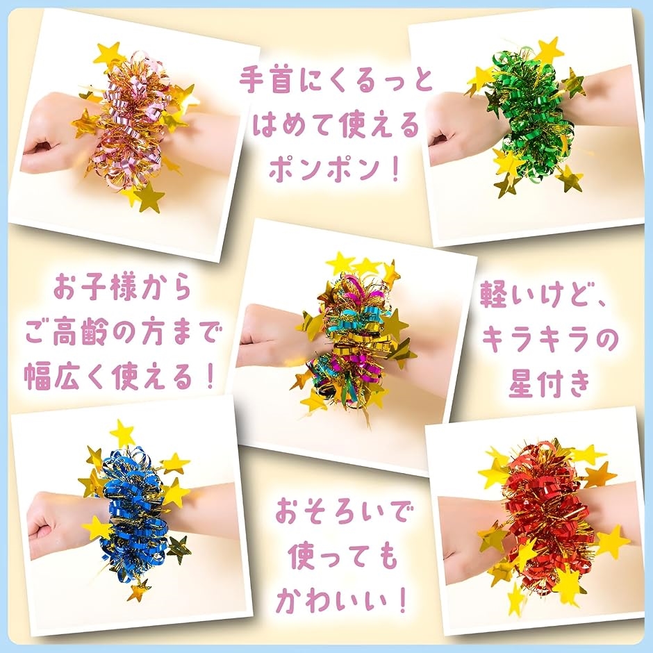 手首にくるっとはめて使えるポンポン。軽いけど、キラキラの星付きのメッキテープなので、存在感たっぷり。