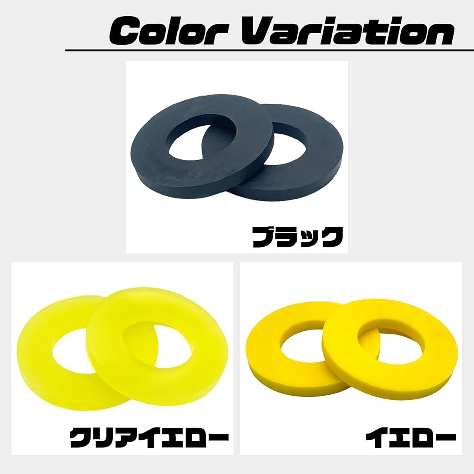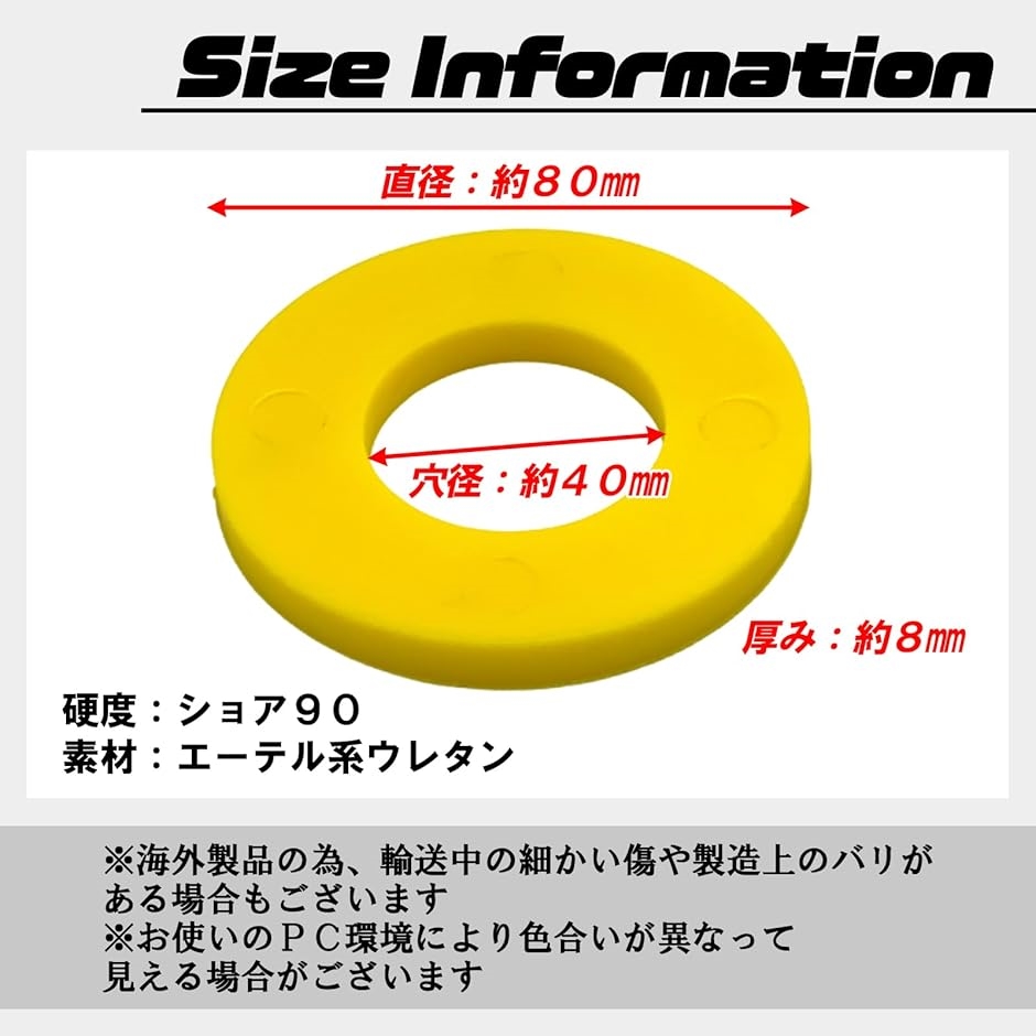 「仕様」硬度:ショア90 / 素材:エーテル系ウレタン / サイズ:直径(約)80mm、内径(約)40mm(穴径)、厚さ(約)8mm / セット数:2個 / カラー:イエロー(黄色)、クリアイエロー、ブラック(黒)