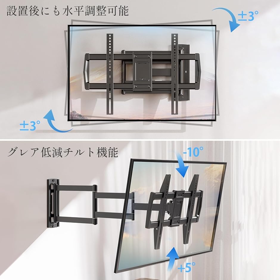 | 商品名 | テレビ壁掛け金具 大型 テレビアーム 42〜75インチ アーム延長 耐荷重35kg 移動式 tv壁掛け 上下&左右&前後調節可能 VESA最大400x400mm対応 フルモーション式 かべかけ金具 |