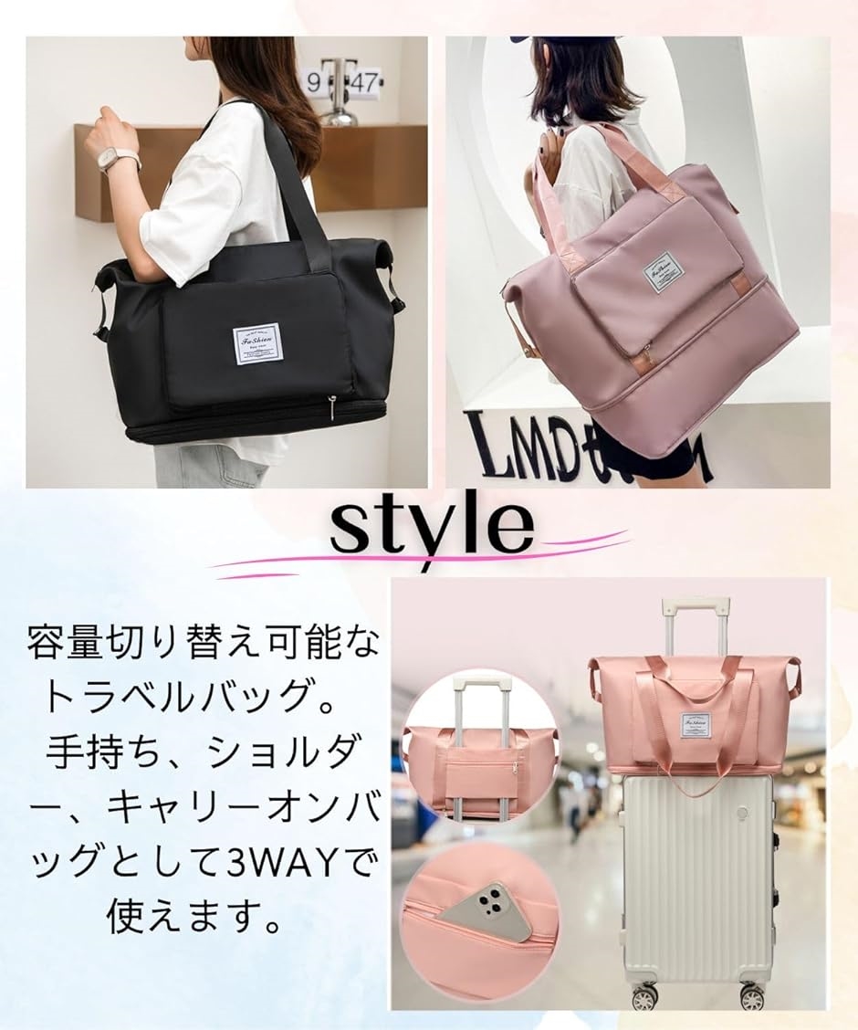 容量切り替え可能な多機能ボストンバッグ:手持ち・ショルダー・キャリーオンバッグとして使える3WAY仕様の旅行バック。