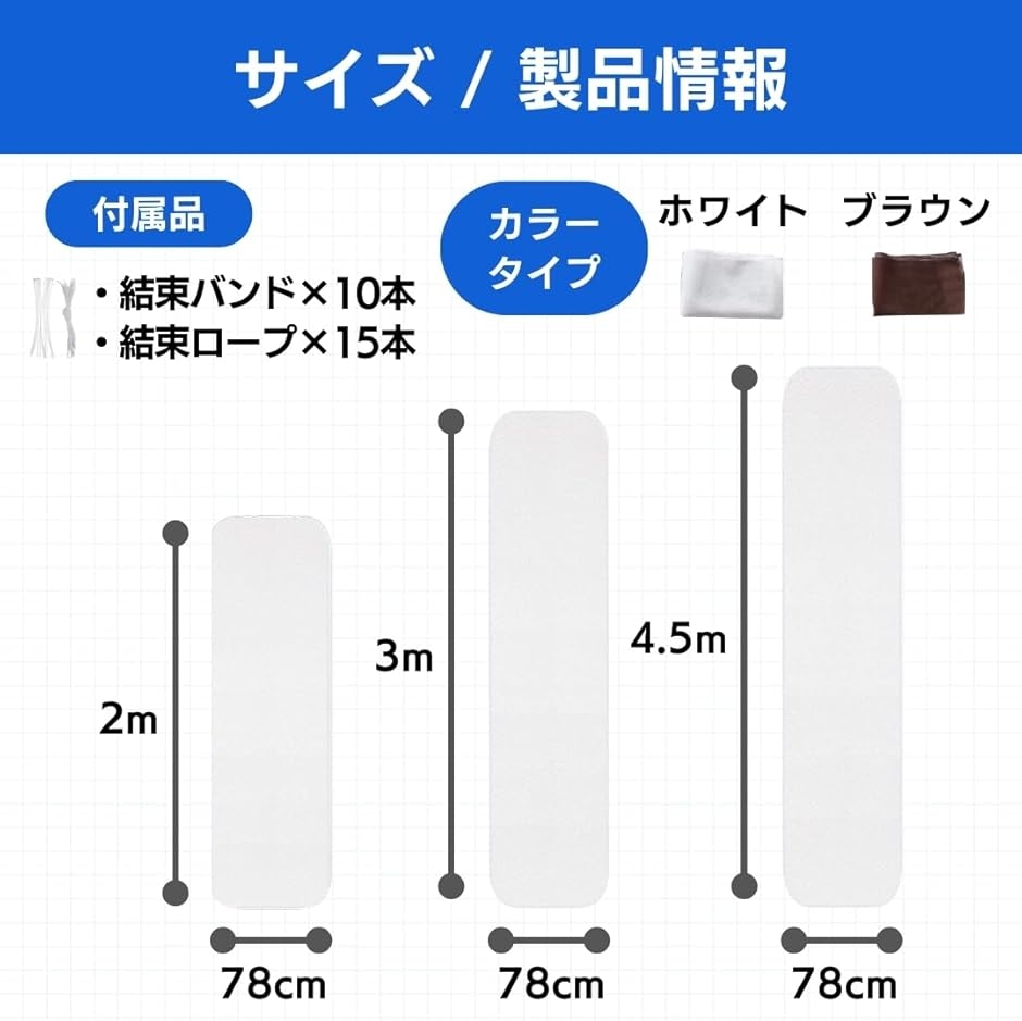 「サイズ」・縦=2mx横=78cm・縦=3mx横=78cm・縦=4.5mx横=78cm「カラーバリエーション」・ホワイト・ブラウン「付属品」・結束バンドx10本・結束ロープx15本