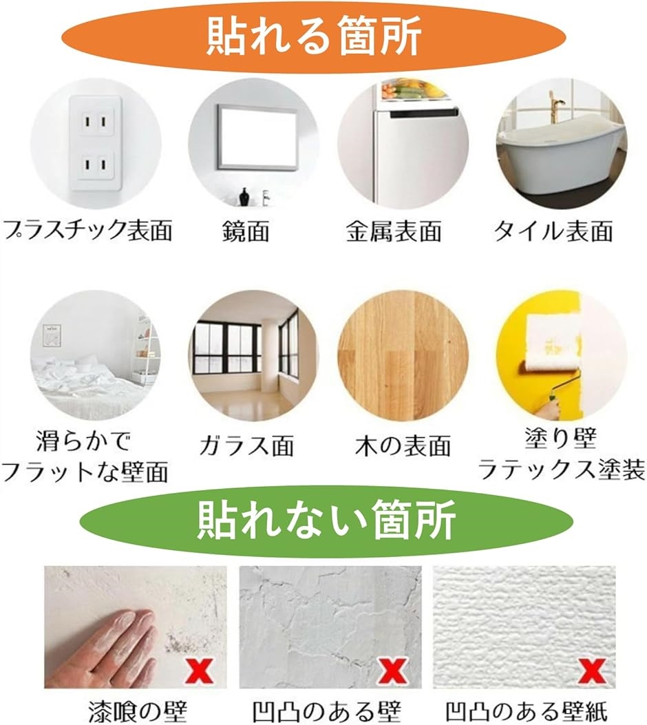 ・凹凸の多い壁や壁紙、漆喰の壁は貼れない場合がございます。
