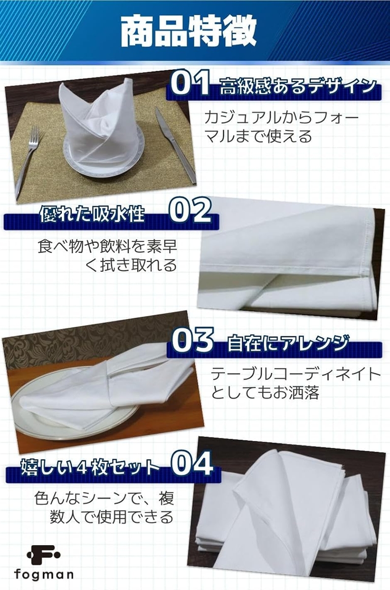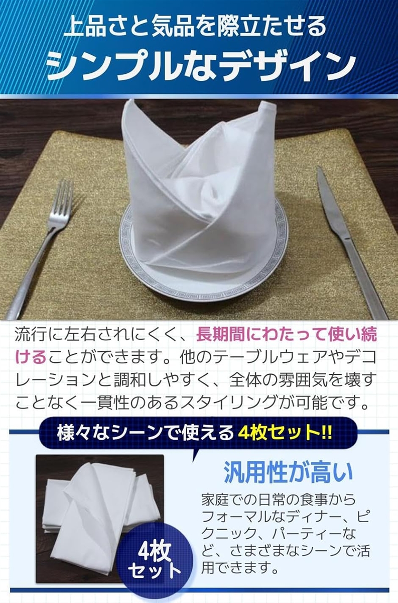 「商品特徴」(1)高級感あるデザイン:カジュアルからフォーマルまで使える/(2)優れた吸水性:食べ物や飲料を素早く拭き取れる/(3)自在にアレンジ:テーブルコーディネイトとしてもお洒落/(4)嬉しい4枚セット:色んなシーンで、複数人で使用できる