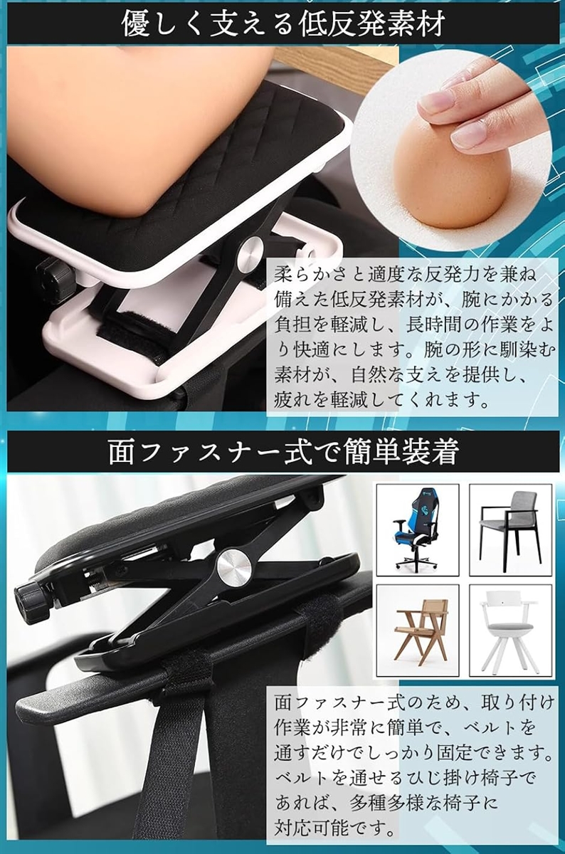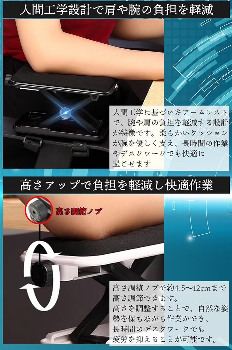 「疲労軽減」低反発クッションで腕を優しくサポートし、長時間の作業でも腕や肩の疲労を大幅に軽減します。