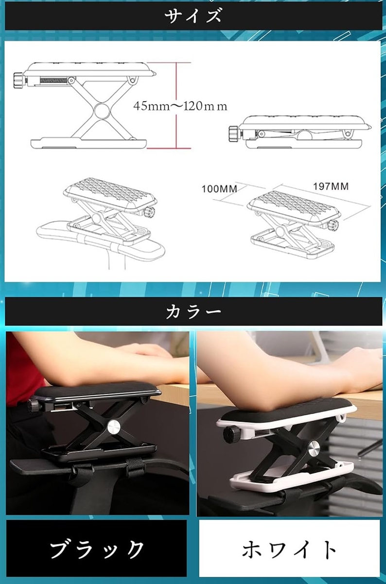 | 商品名 | 肘置き 椅子 デスク クッション 肘クッション テレワーク 高さ調節可能 ブラック |