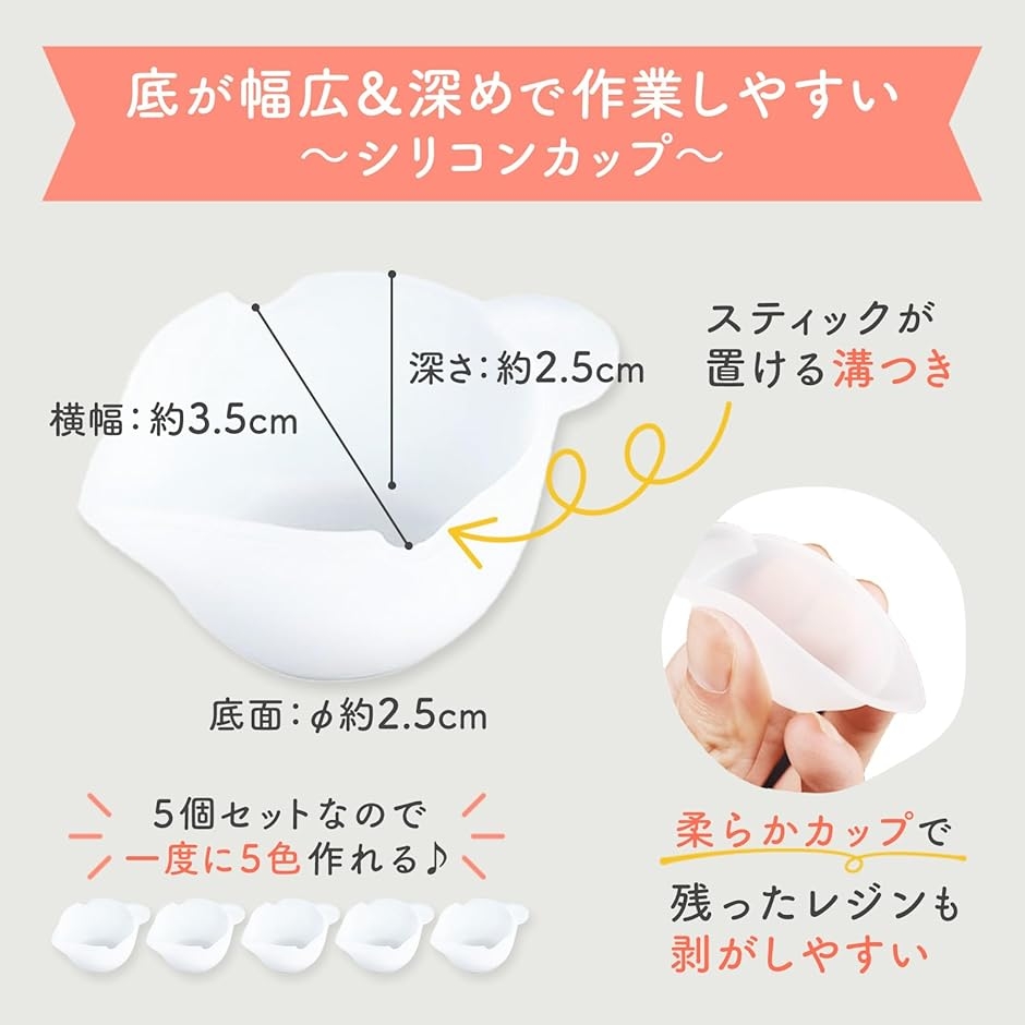 「製品仕様」調色パレット(シリコンカップ)5枚、調色スティック2本、OM(ポリアセタール)製。