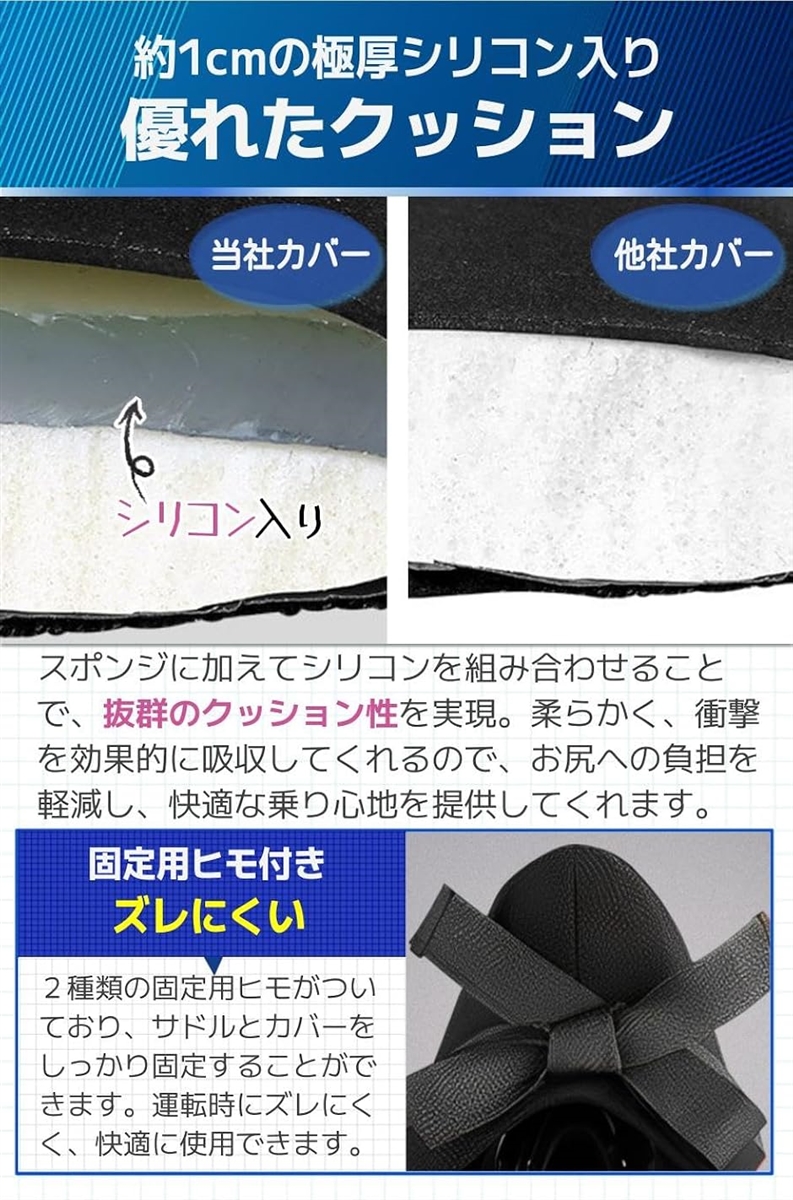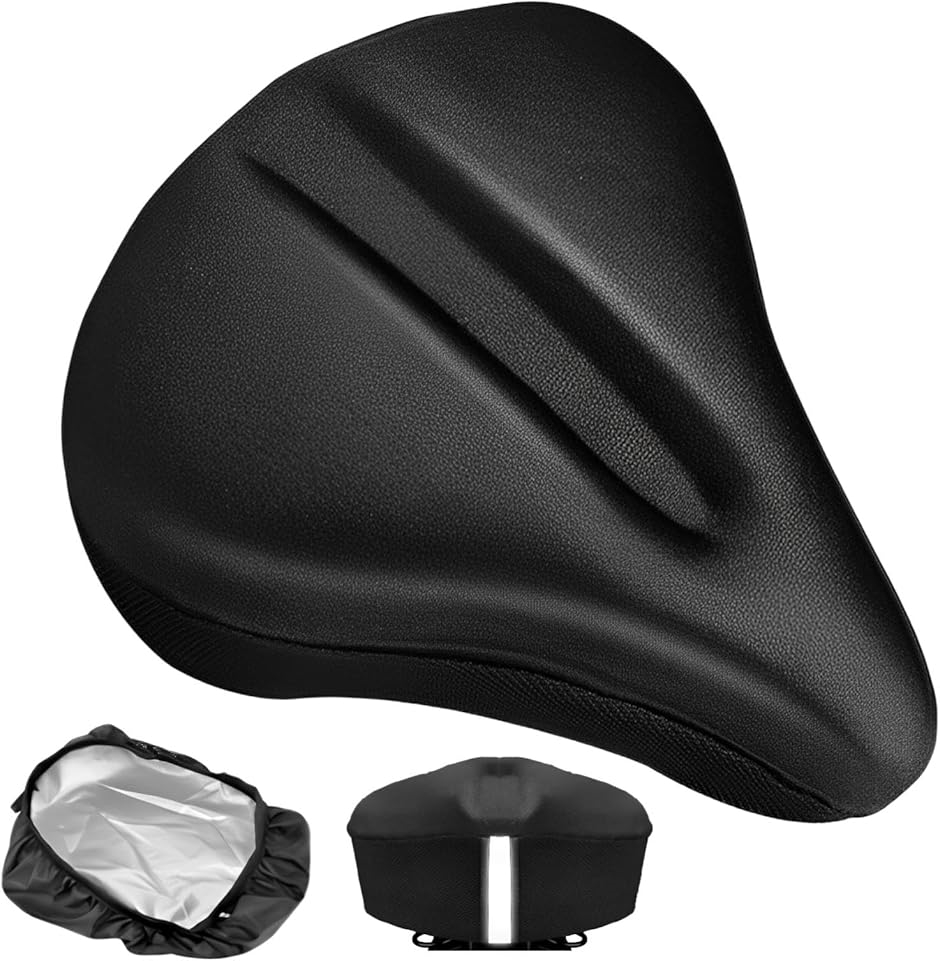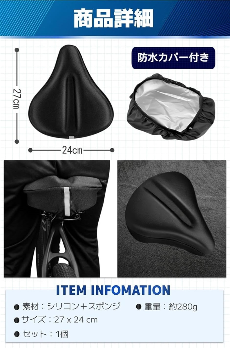 「商品特徴」(1)裏面滑り止め付き:カバーの裏面に滑り止め粒子付き/(2)反射ストリップ:走行時の安全性を高めてくれる/(3)固定ヒモ付き:サドルとカバーを固定してズレにくい/(4)高品質クッション:通気性が良く蒸れにくい「商品詳細」素材:シリコン+スポンジサイズ:27 x 24 cm/セット:1個/重量:約280g/