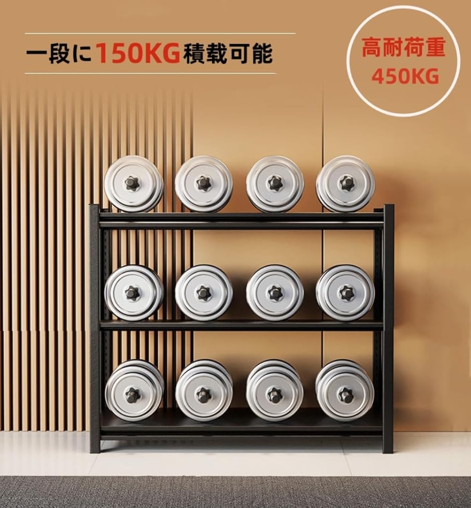 耐荷重は棚板1枚あたり150kg、全体耐荷重約450kg、重量物や大型アイテムの収納にも安心してご利用いただけます。
