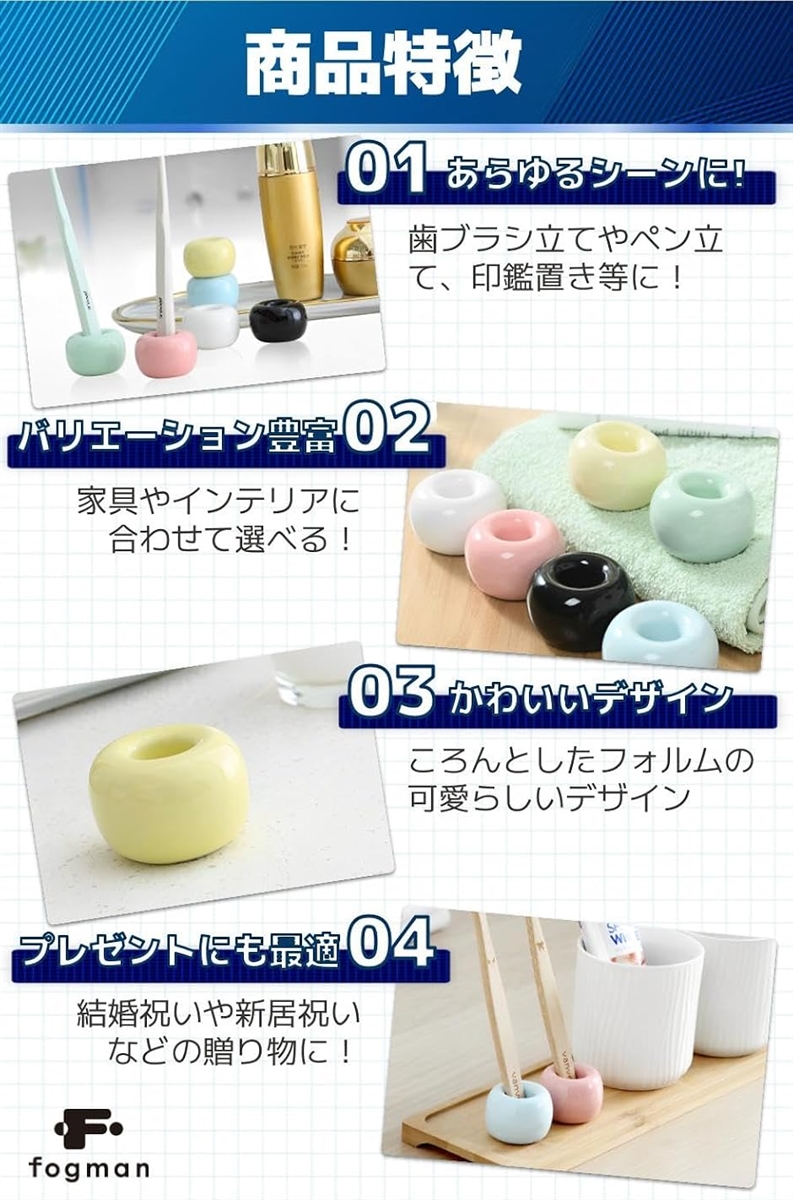 「商品特徴」(1)あらゆるシーンに.:歯ブラシ立てやペン立て、印鑑置き等に。/(2)バリエーション豊富:家具やインテリアに合わせて選べる。/(3)かわいいデザイン:ころんとしたフォルムの可愛らしいデザイン/(4)プレゼントにも最適:結婚祝いや新居祝いなどの贈り物に。