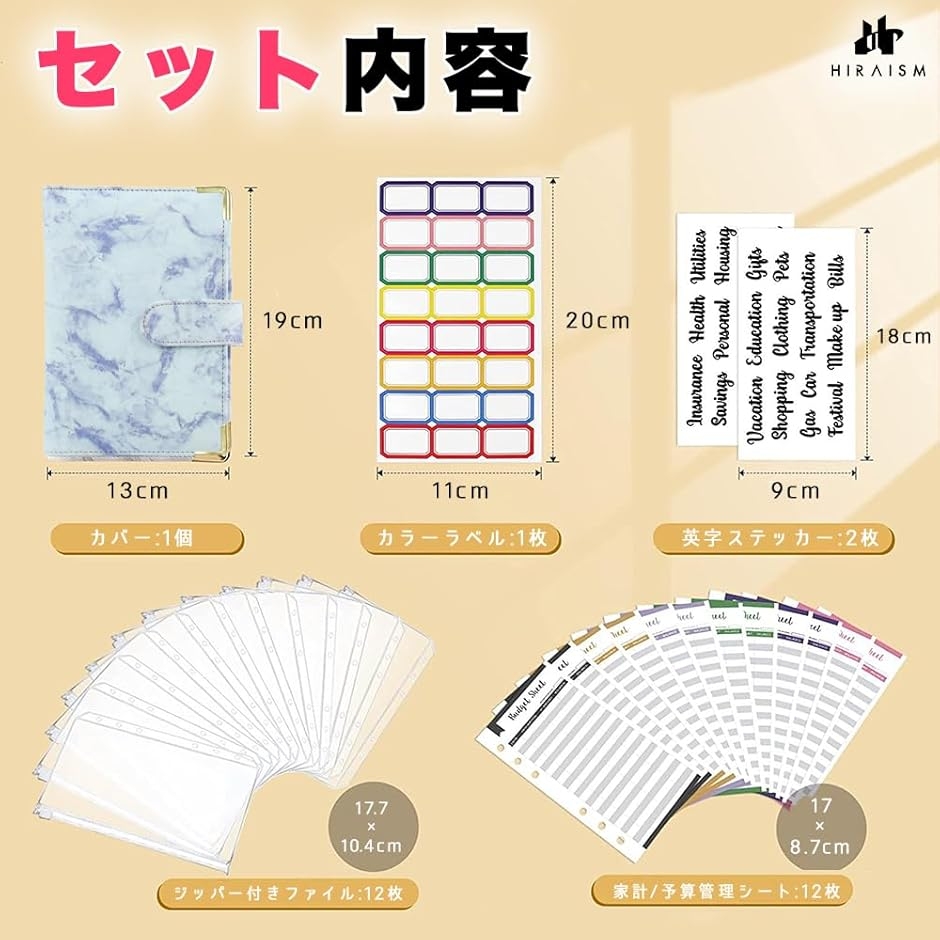 「商品内容」製品サイズ:19x13cm 適用:A6 仕様:ルーズリーフ ジッパー付きクリアケース:12枚 予算管理シート:12枚 英字ステッカー:2枚 カラーラベルシール:1枚 素材;PUレザー カラー:ピンク