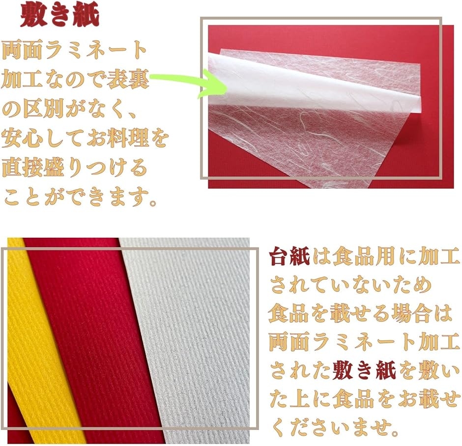 「注意点(1)」台紙となる厚紙にお食事を盛り付ける場合、台紙には食品を直接置ける加工はしておりませんので付属の懐紙や敷き紙を食品の下に敷いて台紙の上にお載せ下さい。