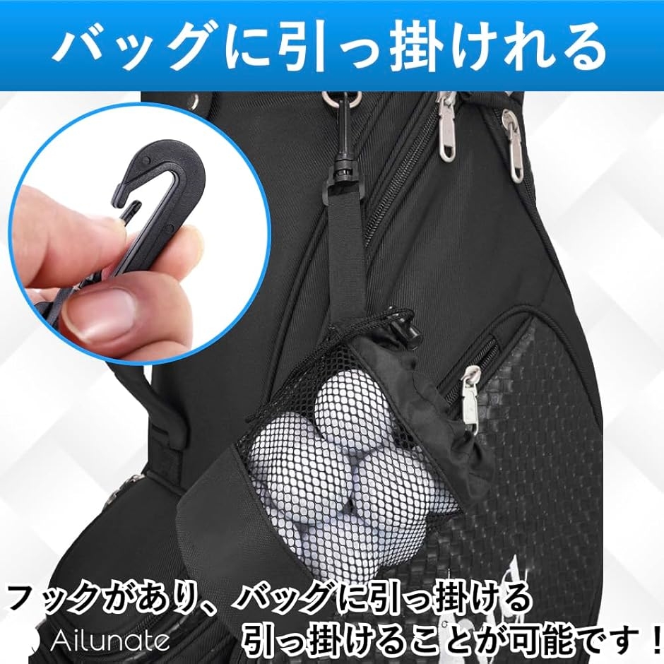 「ゴルフクラブバッグに引っ掛けれる」フックが付いており、ゴルフバッグに引っ掛けることができます。