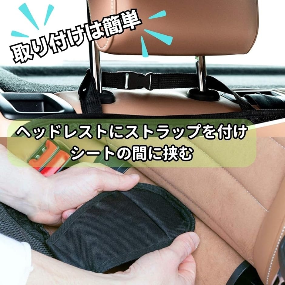 ヘッドレストにストラップを取り付け、シートの間に挟むだけ。