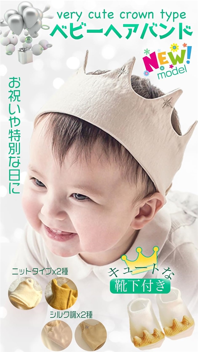 新生児から使える。 王冠モデルのNEWモデル「ベビーヘアバンド」が登場。可愛い靴下ともセットで、0歳から3歳頃まで長くお使いいただけます。