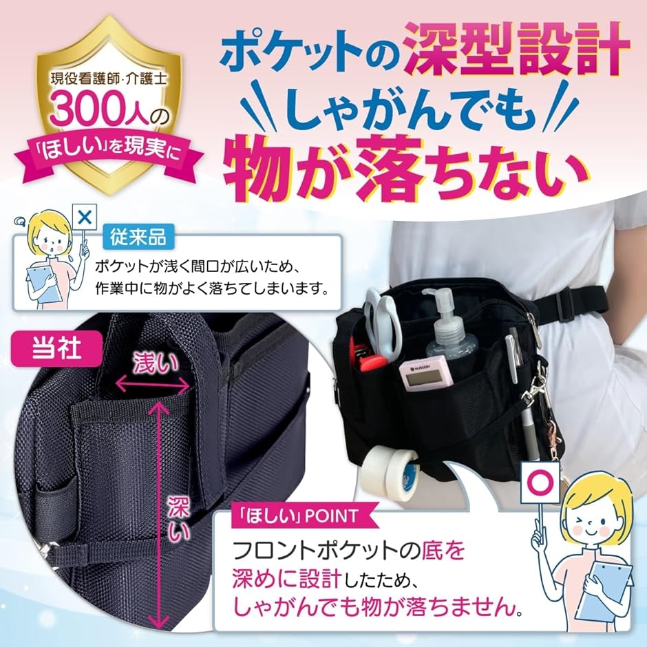 「縫製強化・耐久性の大幅UP」:従来の看護師作業用ポーチの耐久性が弱く、長持ちできない物がほとんどですが、独自の2重縫い加工のベルト通し仕様を採用し、ナースポシェットの耐久性の問題を解決しました。